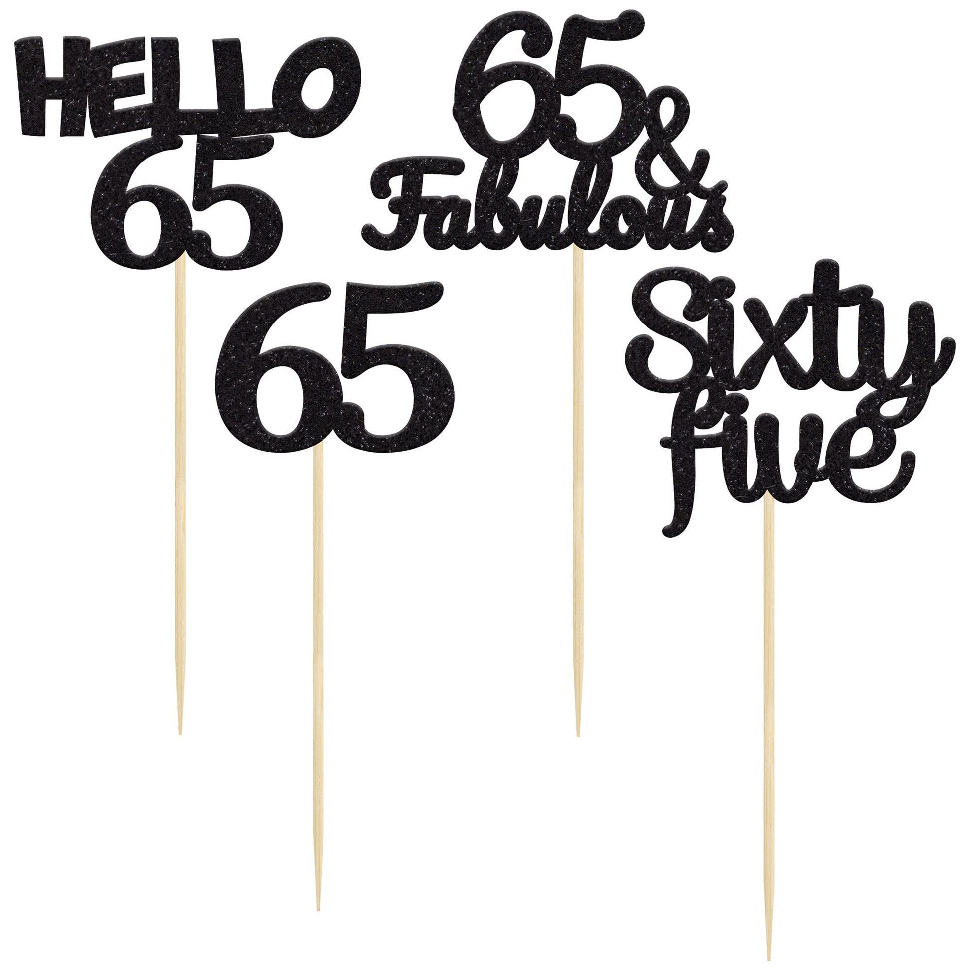 Q: What material are the 65th birthday cupcake toppers made of?A: The 65th birthday cupcake toppers are made of high-quality 300 gram glitter card stock and food-grade toothpicks, ensuring they are safe for use on cakes and desserts.