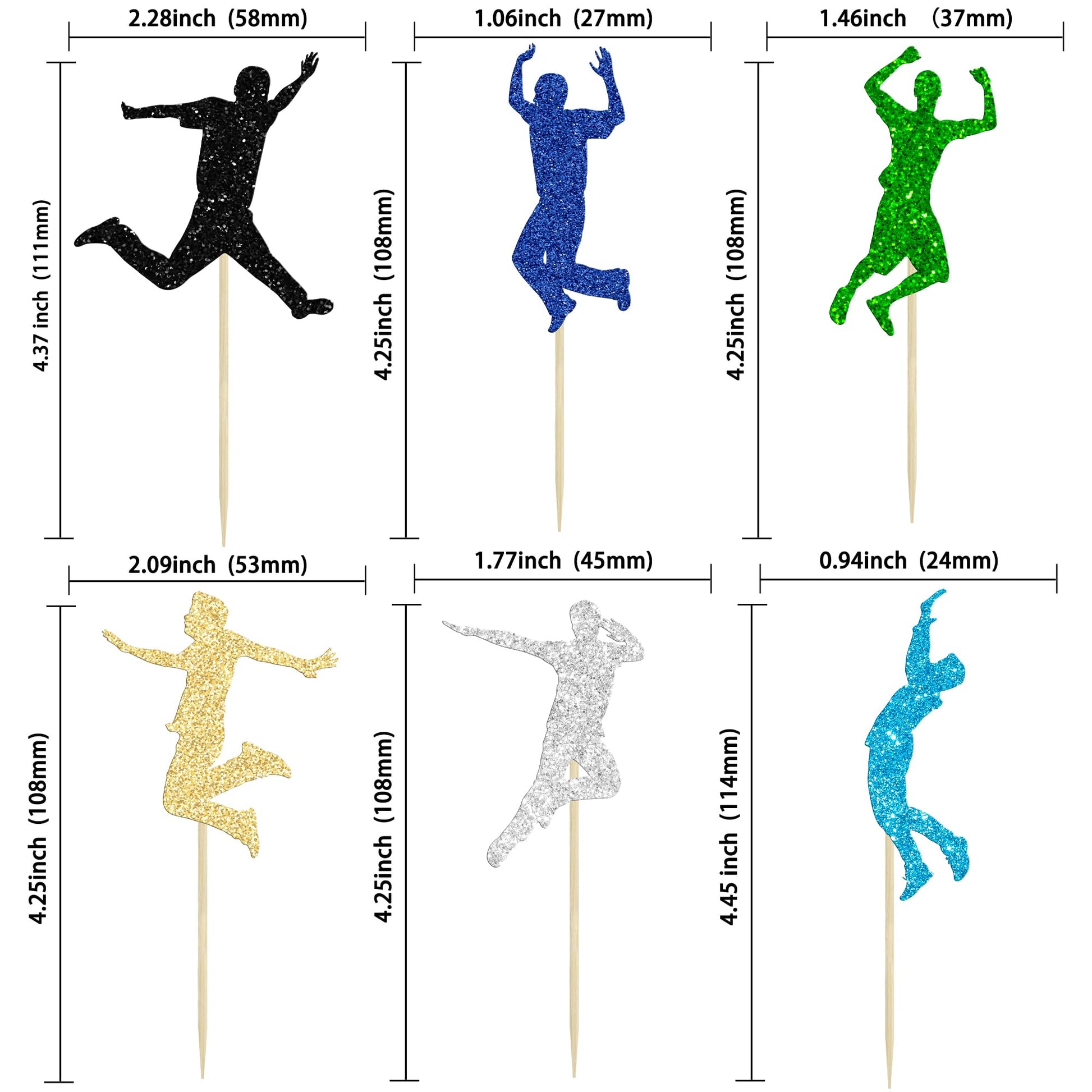 Q: What sizes are the Gyufise Trampoline Cupcake Toppers?A: The Gyufise Trampoline Cupcake Toppers are sized at 2.6 inches wide and 4.9 inches tall, including the stick, making them perfect for a variety of cakes and desserts.