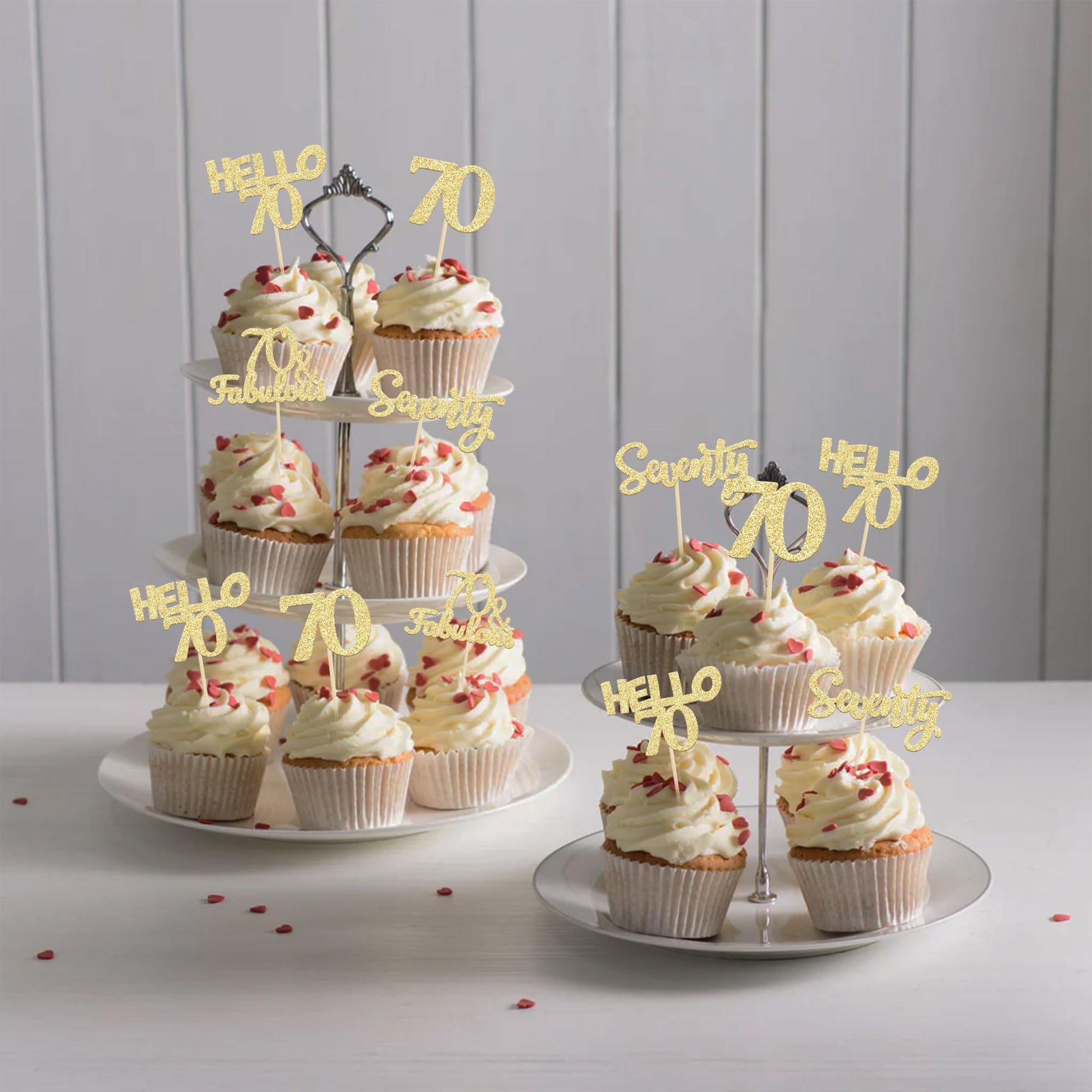 Q: What themes are these cupcake toppers suitable for?A: These cupcake toppers are perfect for 70th birthday celebrations, 70 fabulous parties, and 70th anniversary parties. Their unique design enhances any similar themed party.