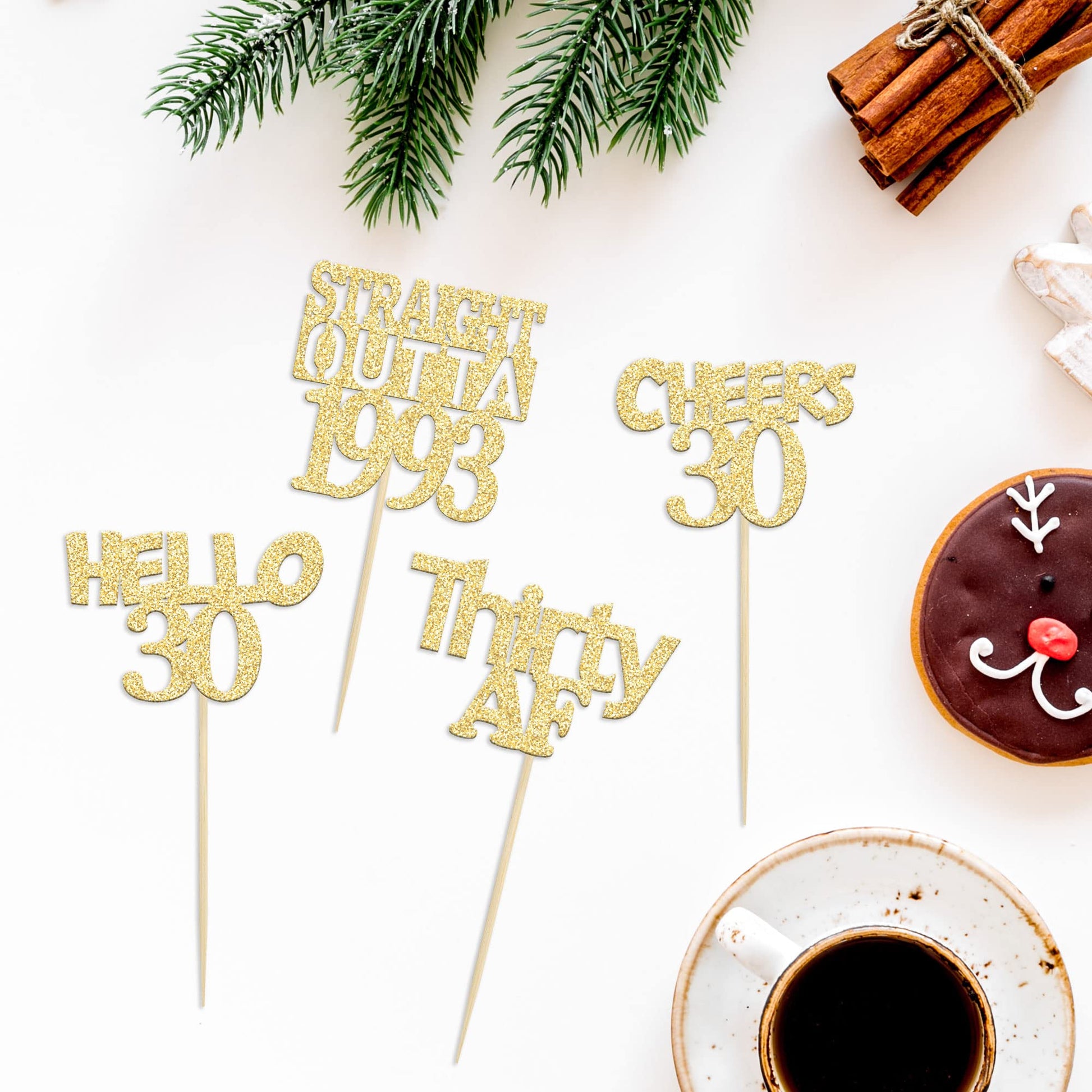 Q: What are the dimensions of the Gyufise 30th birthday cupcake toppers?A: The Gyufise cupcake toppers are 2.6 inches wide and 4.9 inches high, or 6.5 cm wide and 12.4 cm high, including the stick.