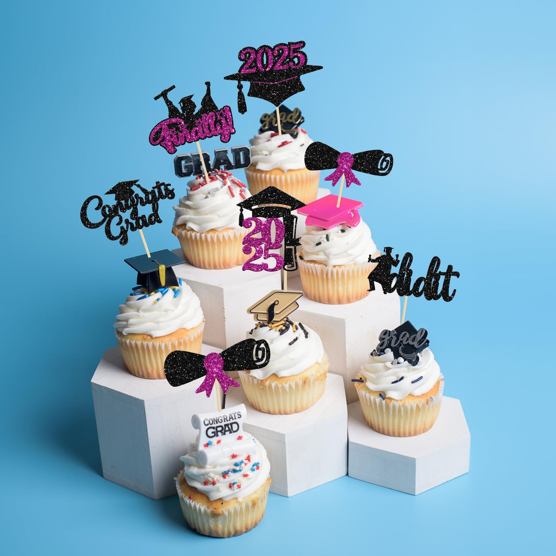 Q: Are these cupcake toppers suitable for different types of desserts?A: Absolutely! These cupcake toppers are versatile and can be used on cupcakes, cakes, ice cream, fruit, cookies, and other desserts, adding a festive touch to any graduation celebration.