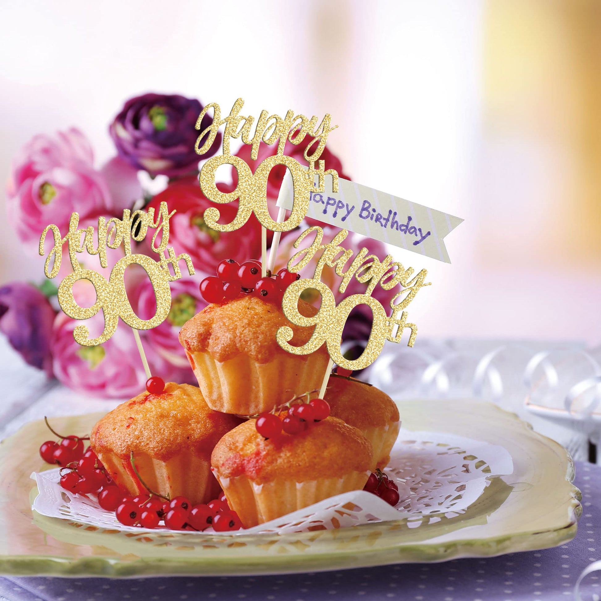 Q: How many cupcake toppers come in a package?A: Each package includes 24 pieces of the Happy 90th Birthday Cupcake Toppers, perfect for decorating multiple cupcakes or desserts.