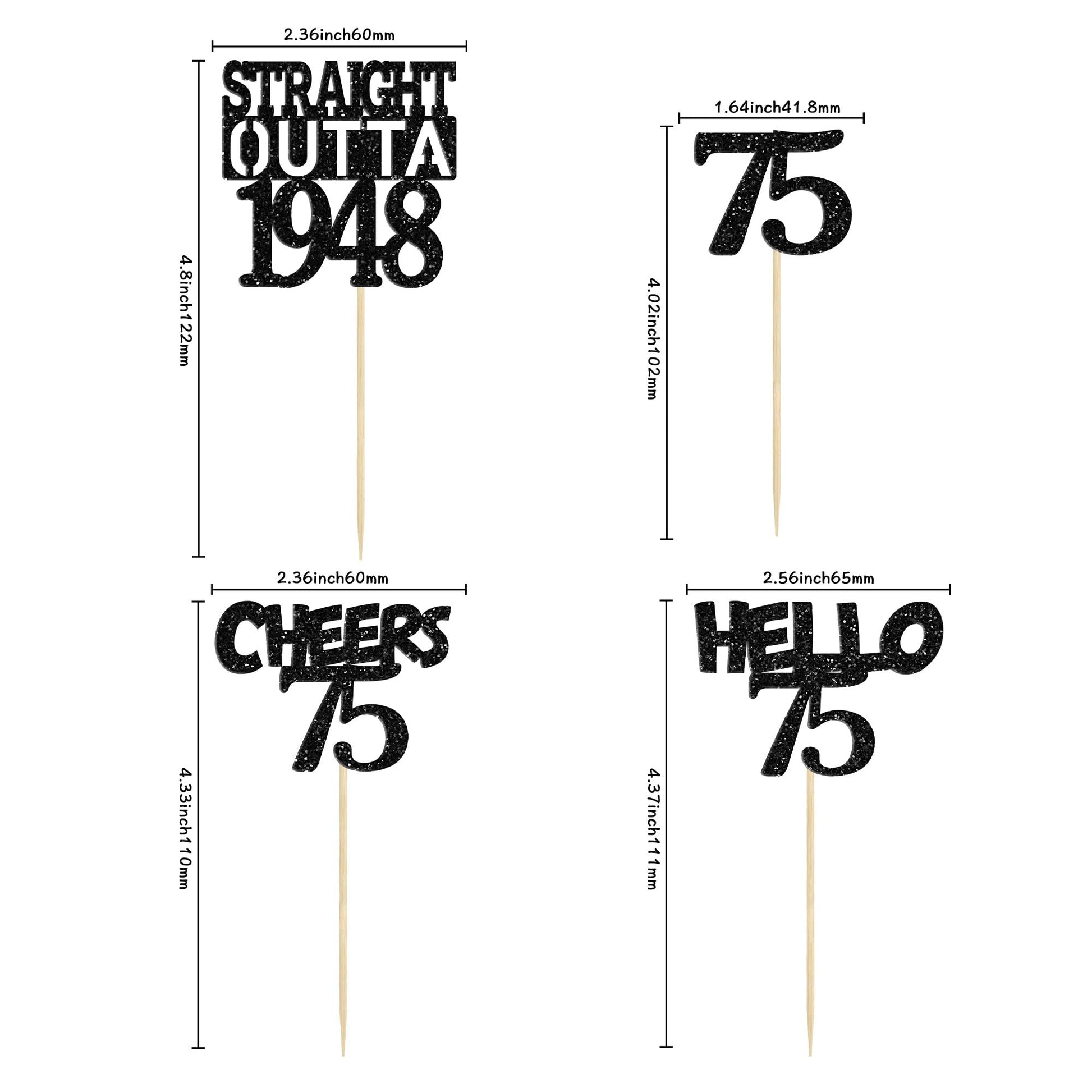 Q: What are the dimensions of the Gyufise 75th Birthday Cupcake Toppers?A: The Gyufise 75th Birthday Cupcake Toppers measure approximately 2.4 inches in width and 4.3 inches in height, including the stick.