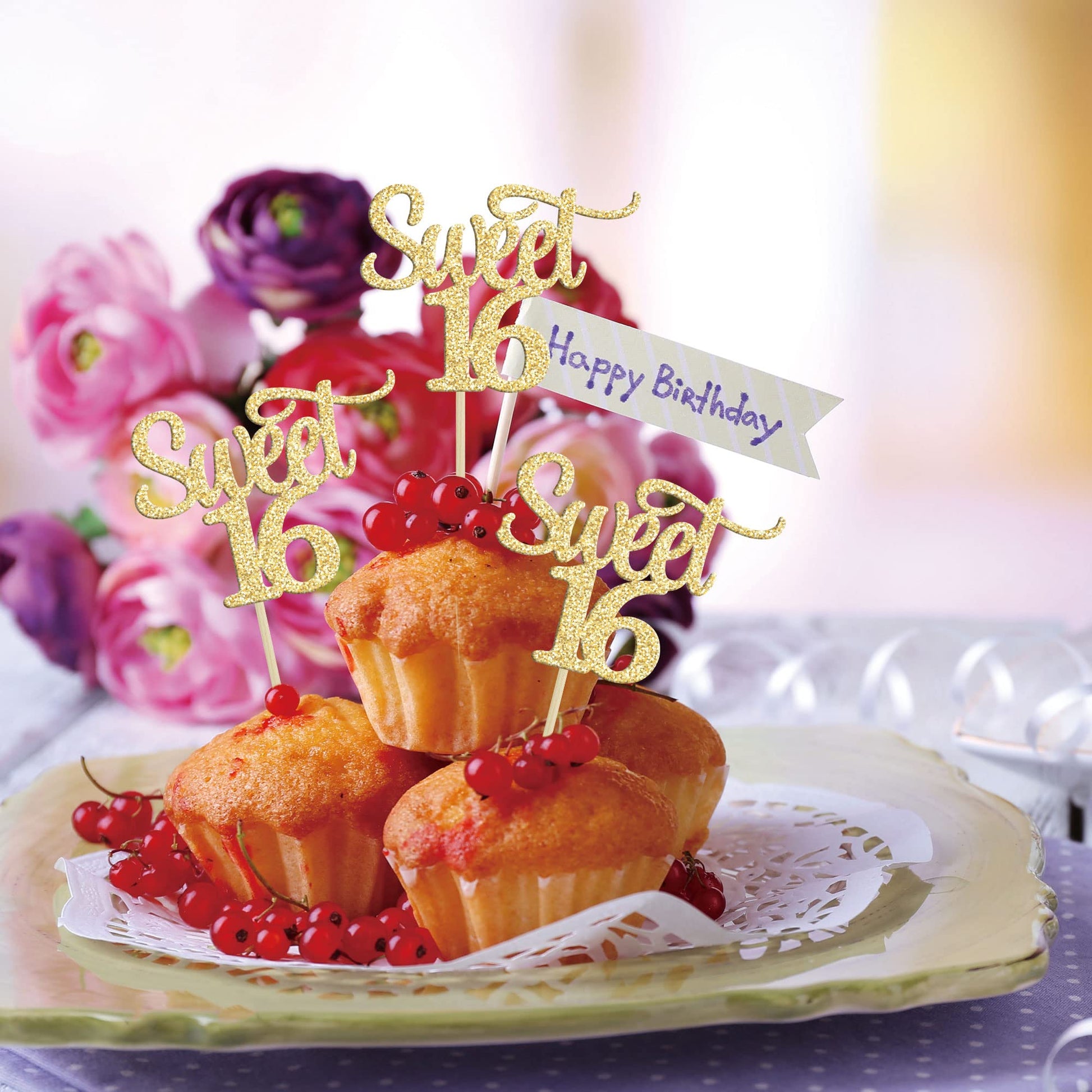 Q: Can I use these cupcake toppers for other desserts besides cakes?A: Yes, these Sweet 16 Cupcake Toppers are versatile and can be used on various desserts such as cupcakes, ice cream, fruits, cookies, and other sweet treats, making them perfect for 16th birthday and anniversary celebrations.