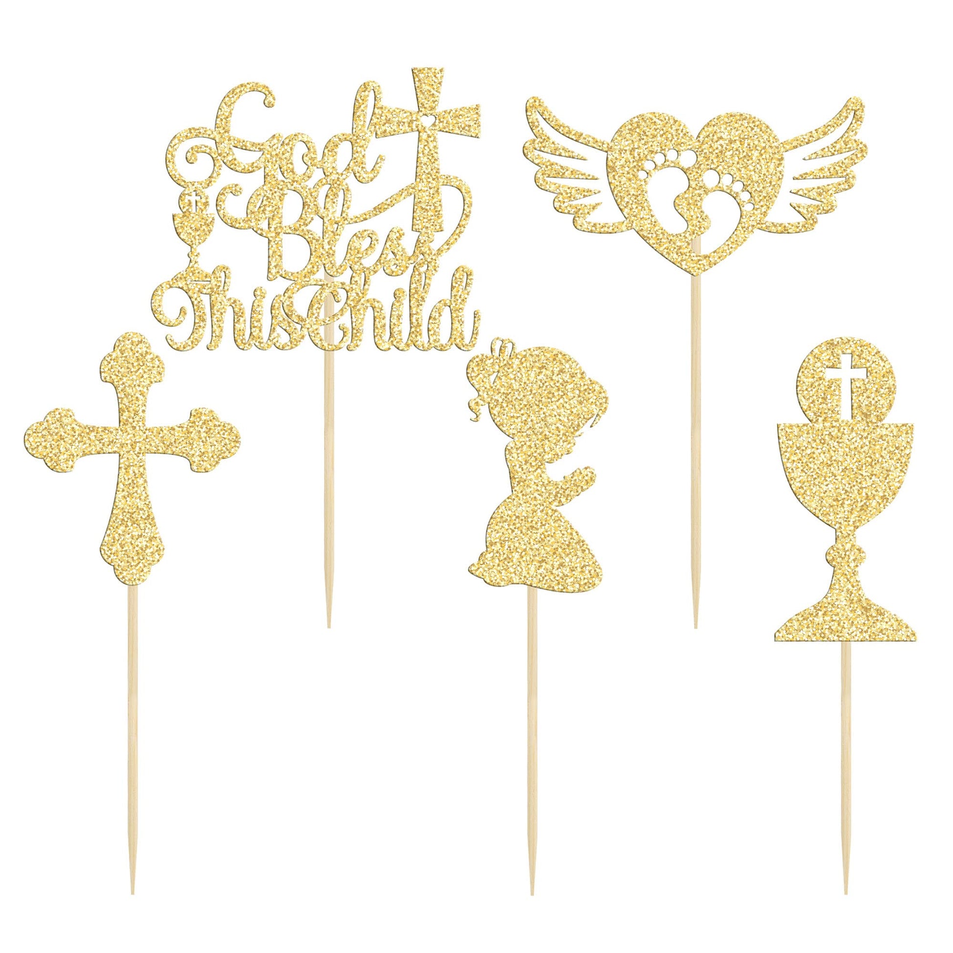 Q: What are the dimensions of the God Bless This Child cupcake toppers?A: Each cupcake topper measures approximately 2.6 inches in width and 4.3 inches in height, including the stick, making them a perfect size for decorating cupcakes and cakes.