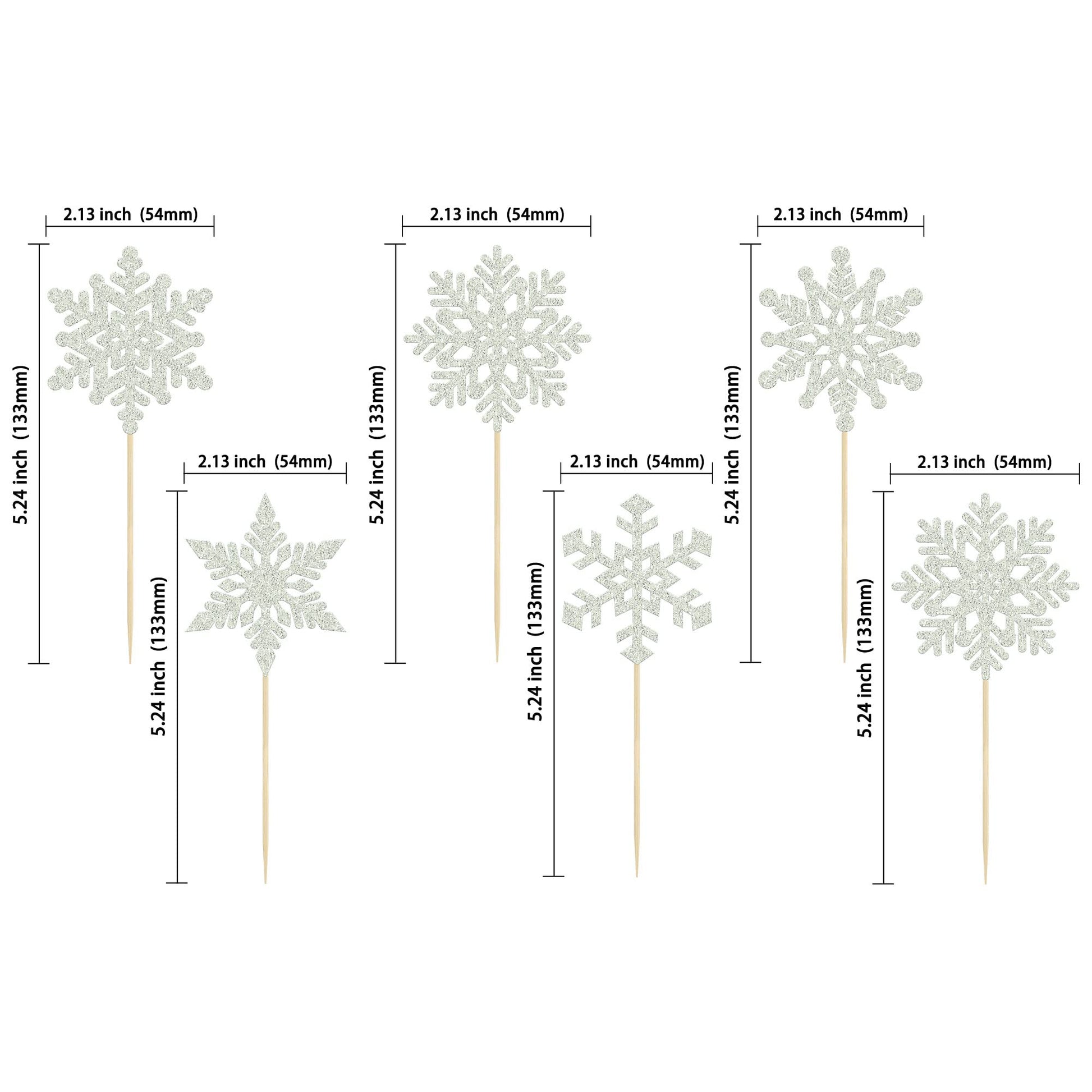 Q: What are the dimensions of the Gyufise Snowflake Cupcake Toppers?A: The Gyufise Snowflake Cupcake Toppers measure approximately 2 inches wide and 5.5 inches tall (including the stick), or 5.2 cm wide and 14 cm tall.