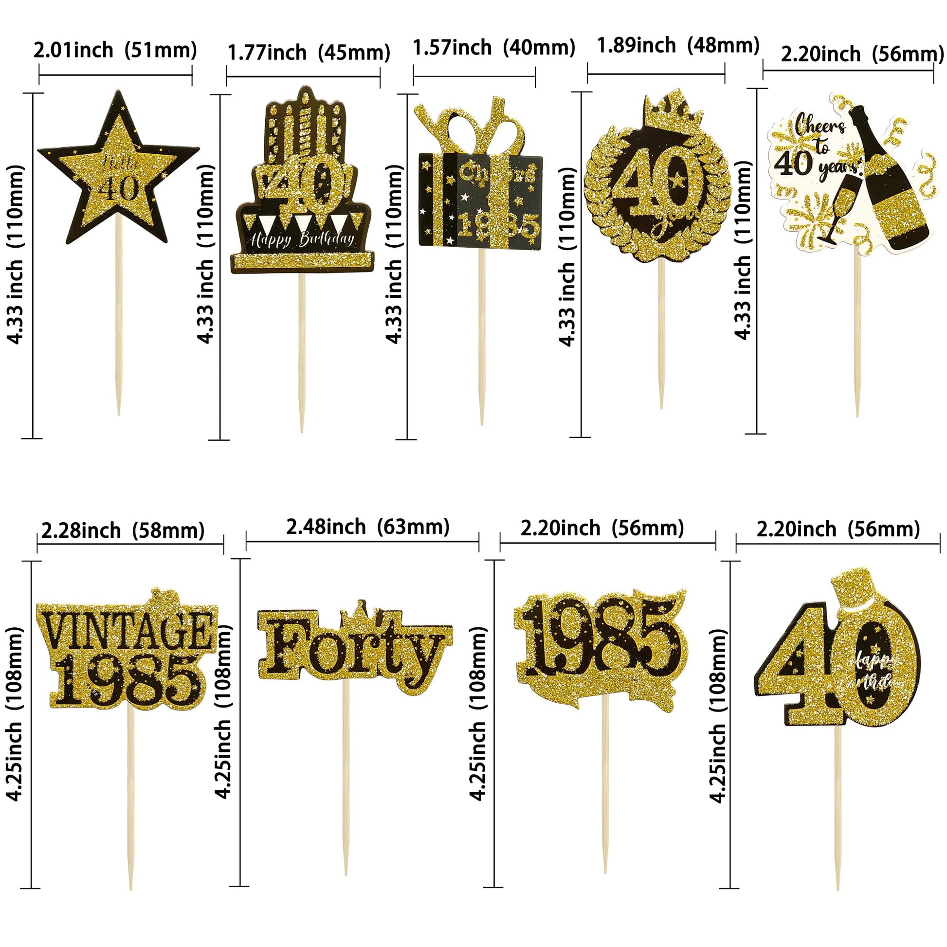 Q: What are the dimensions of the Gyufise 40th Birthday Cupcake Toppers?A: The cupcake toppers measure approximately 2.4 inches in width and 3.9 inches in height (including the stick), making them a perfect size for decorating cakes and cupcakes.