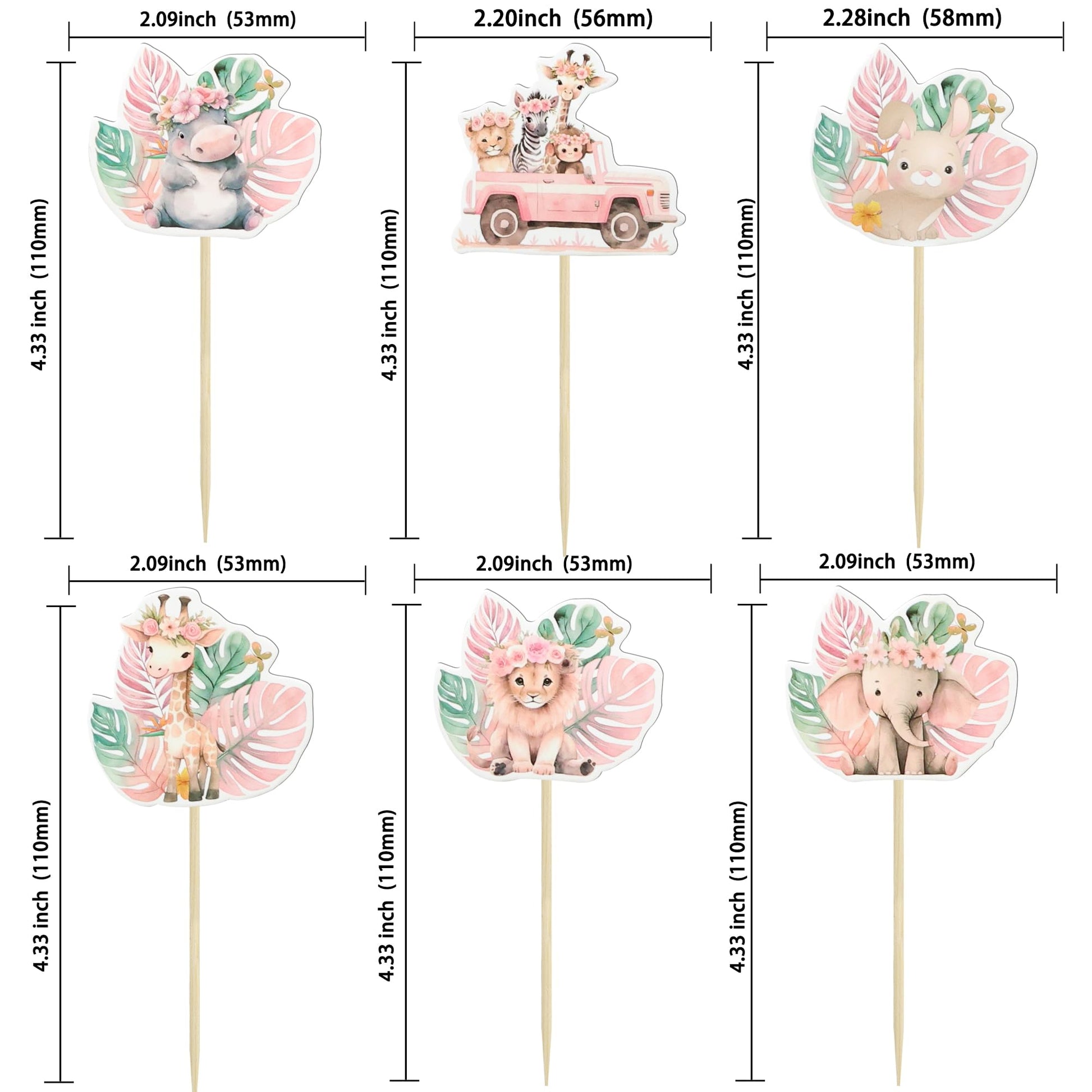 • Q: What are the dimensions of the Gyufise Pink Safari Cupcake Toppers? A: The Gyufise Pink Safari Cupcake Toppers measure 2.4 inches in width and 3.9 inches in height (6cm x 10cm), excluding the stick.
