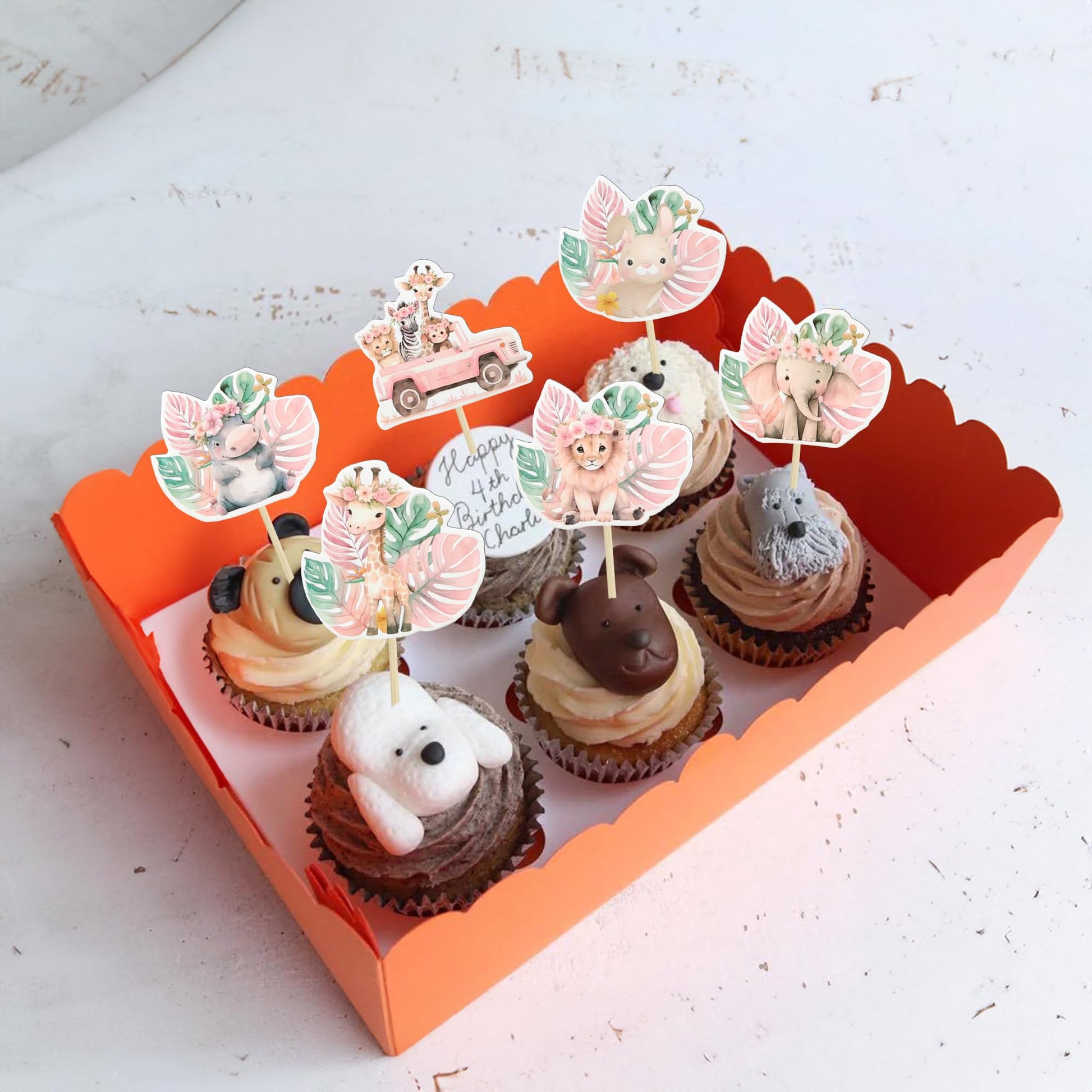 Gyufise 36Pcs Pink Safari Baby Shower Cupcake Topper Floral Jungle Animals Baby Cake Decorations Safari Theme Cupcakes Toppers F
