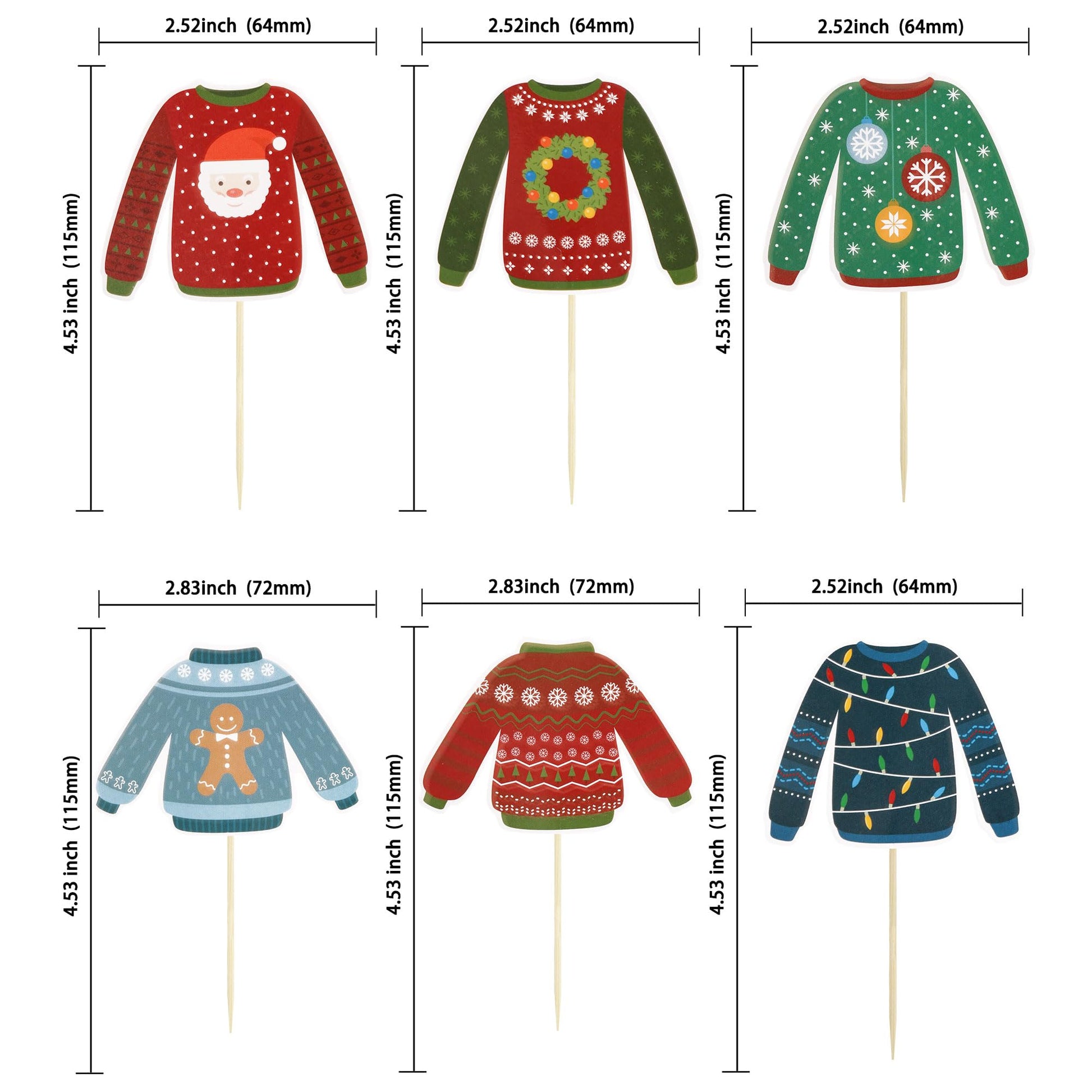 Q: What materials are the Ugly Sweater Cupcake Toppers made from?A: The Ugly Sweater Cupcake Toppers are made from high-quality 300 gram card stock and food-grade toothpicks, ensuring they are safe for use on cakes, cupcakes, and other desserts.