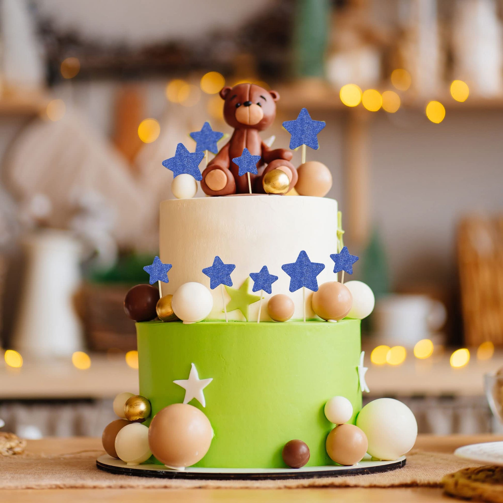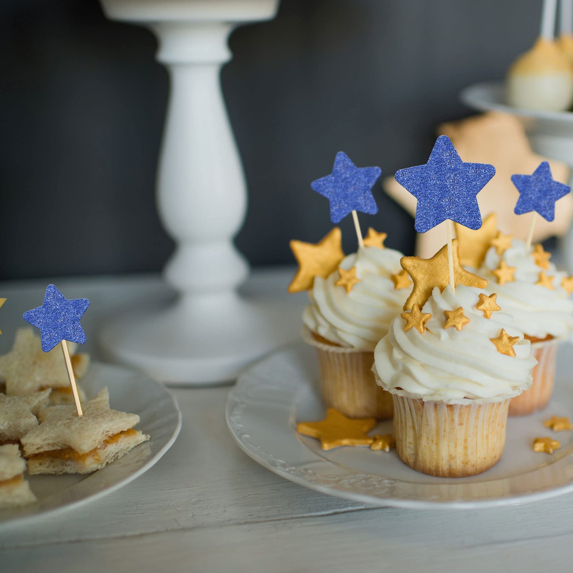 Q: What occasions are these cupcake toppers suitable for?A: These deep blue star cupcake toppers are ideal for various celebrations, including weddings, engagements, bridal showers, baby showers, and birthday parties, enhancing the festive atmosphere of your events.