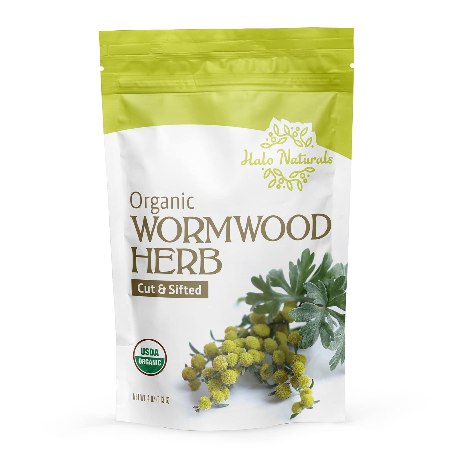 Halo Naturals Organic Wormwood Herb Cut & Sifted, 4 Ounces (Artemisia Absinthium) Usda Certified Wormwood Tea | Non-Gmo | Vegan| Resealable Pouch| Packaged In The Usa (Pack Of 1)