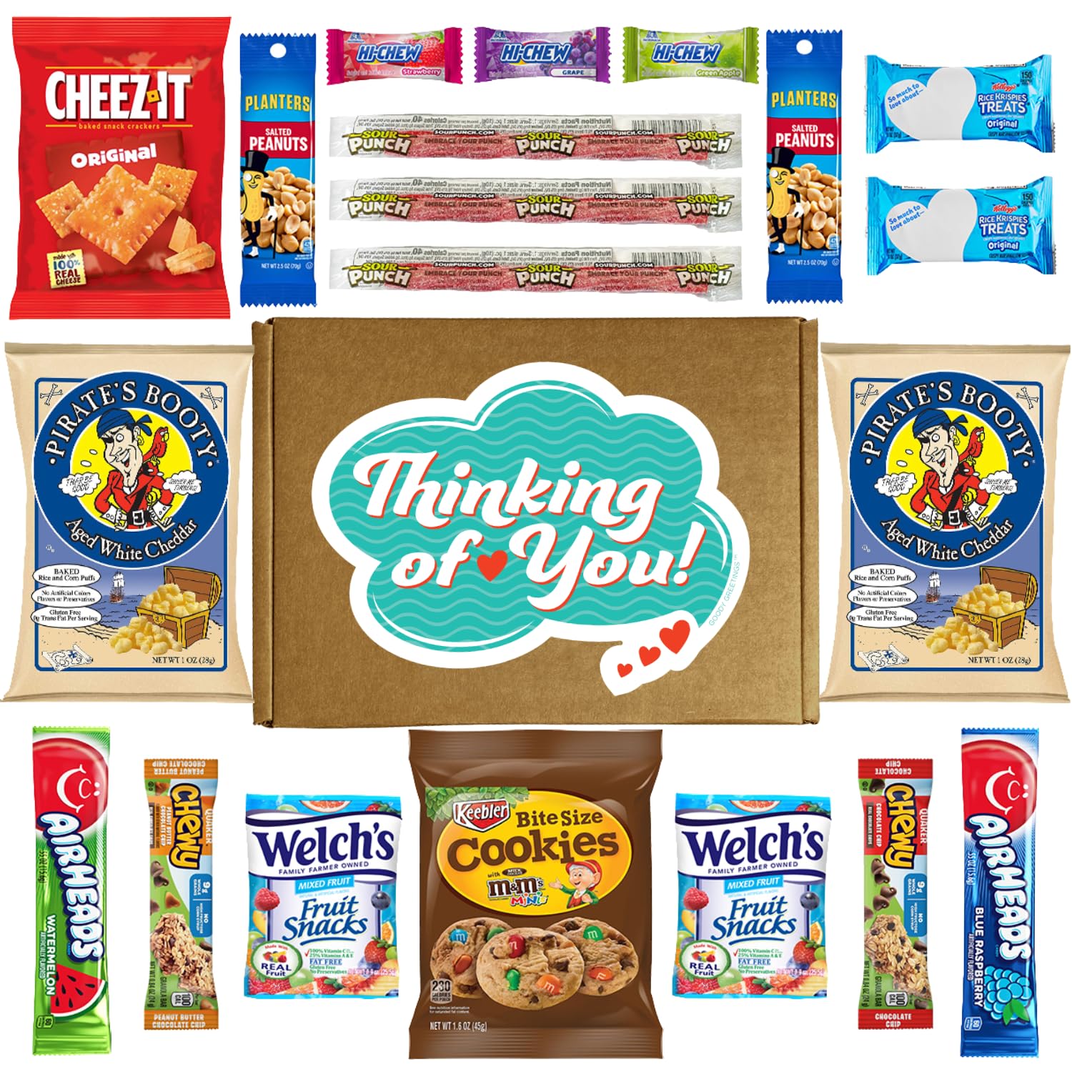 • Q: What snacks are included in the Hangry Kits Thinking Of You gift box? A: The Hangry Kits Thinking Of You gift box includes a variety of comforting snacks such as 2 x Rice Krispies Treats, 2 x Airheads, 3 x Laffy Taffy, 3 x Hi-Chew, 2 x Quaker Granola Bars, 2 x Planters Salted Peanuts, 2 x Welch's Fruit Snacks, 1 x Popchips, 1 x Pirates Booty, 1 x Cheez-It, and 1 x Keebler Bite Sized Mini M&M Cookies.