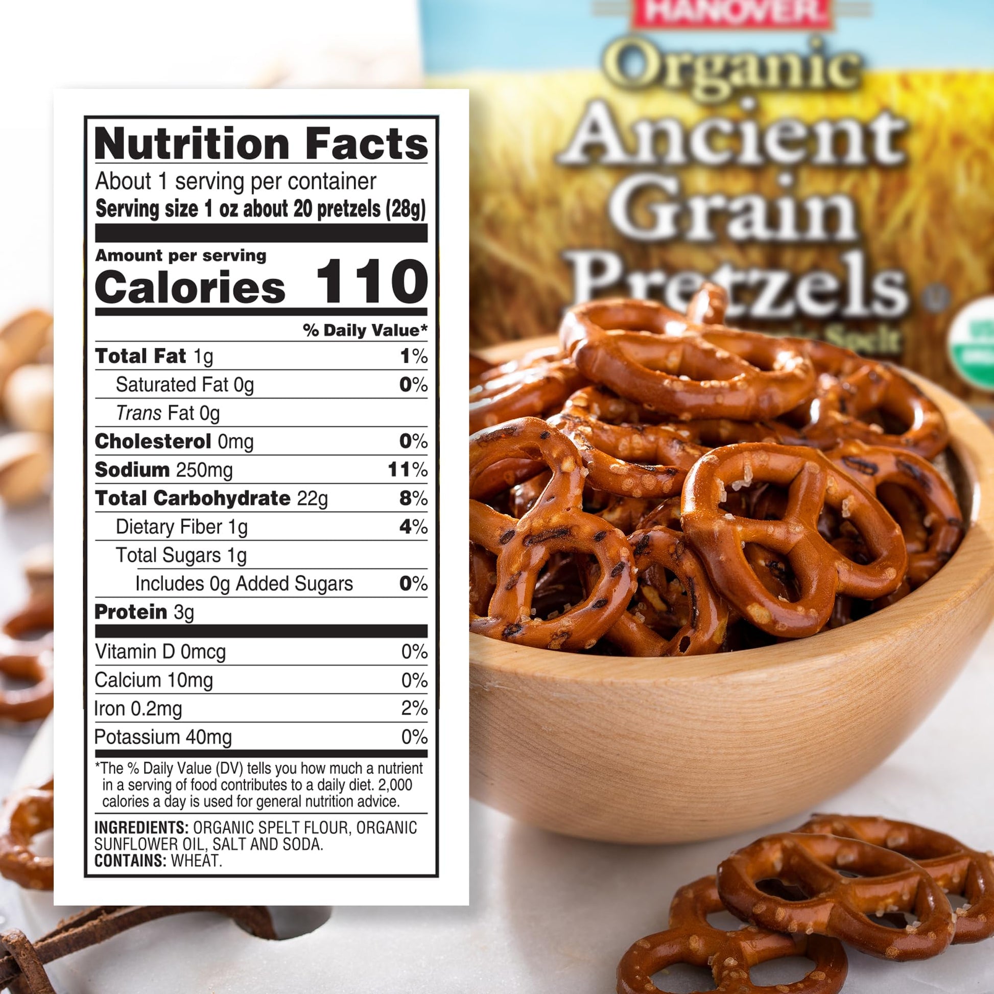 - Q: What are the main ingredients in Hanover Organic Ancient Grain Spelt Sea Salt Pretzels? A: The Hanover Organic Ancient Grain Spelt Sea Salt Pretzels are made primarily from organic spelt flour, which is an ancient whole grain. They are seasoned with sea salt and contain no trans fats, making them a healthier alternative to traditional pretzels.