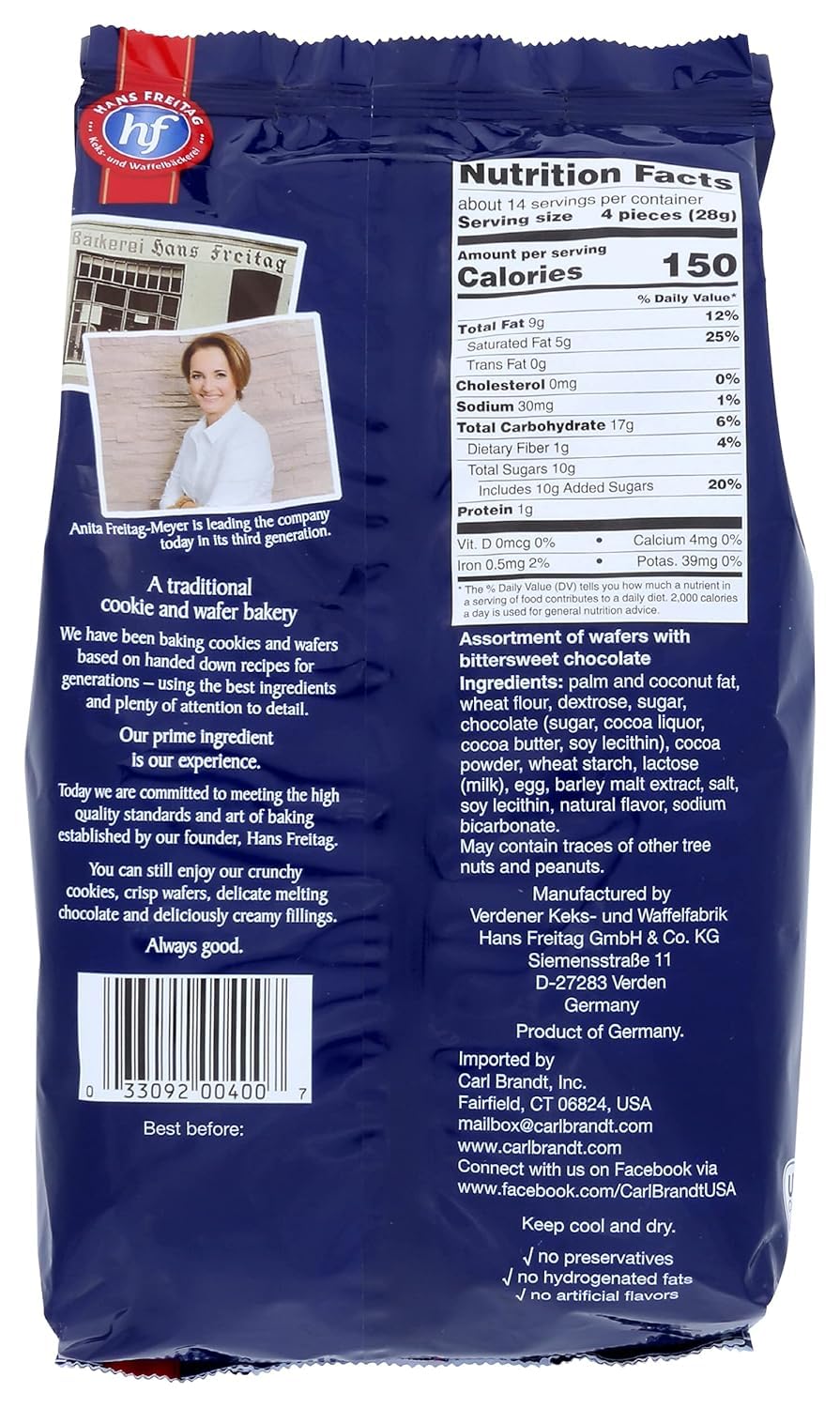 Hans Freitag�s German cookies and wafers are European favorites and top sellers in America. These delicious cookies and crispy wafer assortments come in handy bags. A wide variety features chocolate covered biscuits, cream filled wafers, jam centered cookies and those drizzled with chocolate. The leaders of the pack are Desiree, Noblesse and Noblesse Noir. Desiree being the wafer assortment and Noblesse contains an assortment of both cookies and wafers. Noblesse Noir consists of a biscuit and wafer mix with fine dark chocolate.