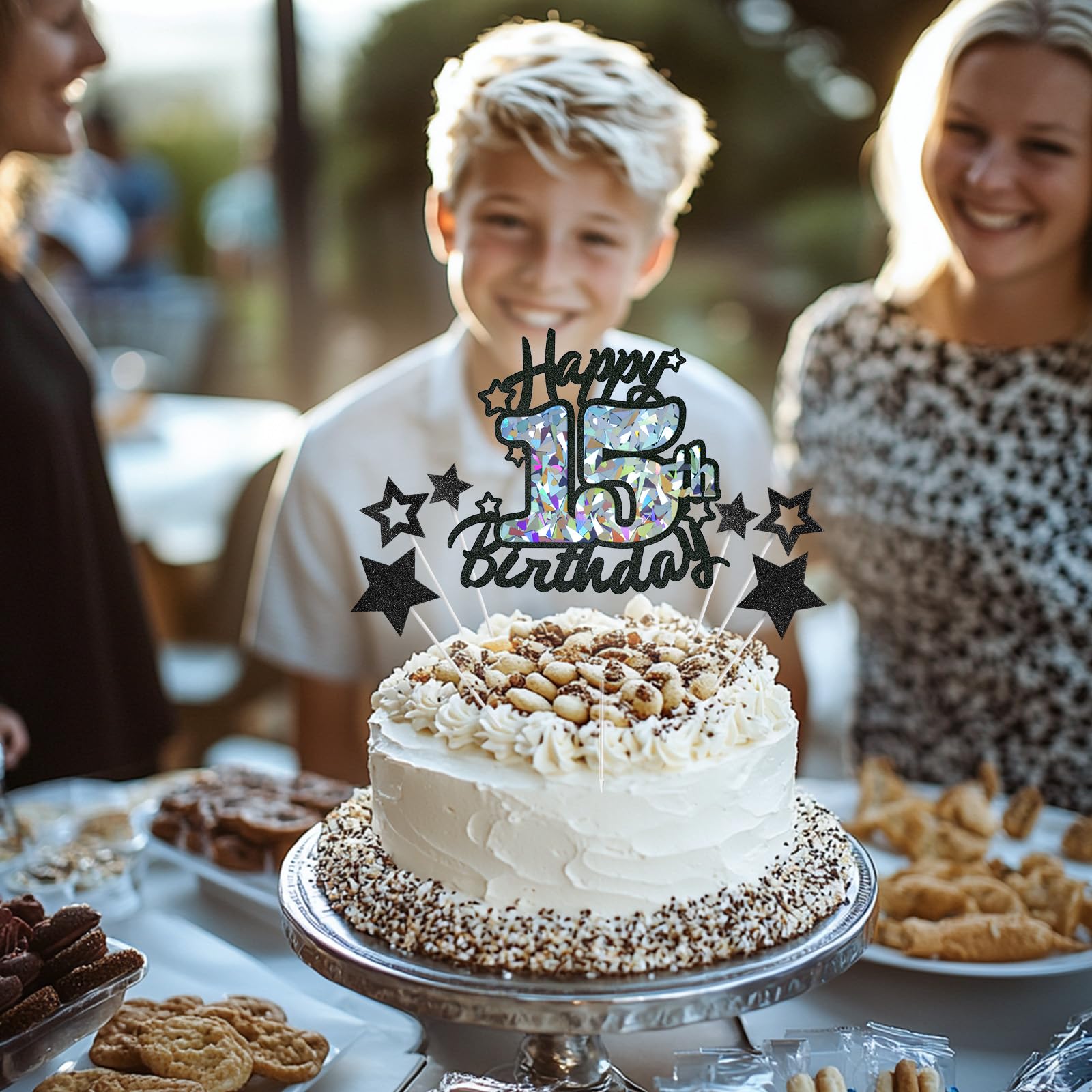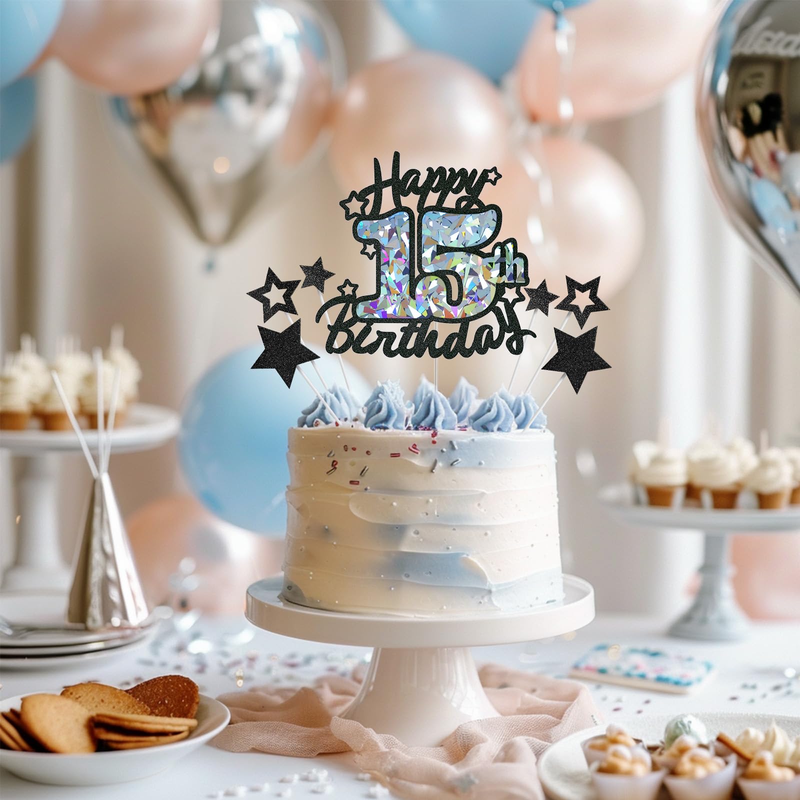 Q: What materials are used in the Happy 15th Birthday Cake Topper?A: The Happy 15th Birthday Cake Topper is crafted from premium glitter card stock, ensuring both durability and a stunning sparkle that enhances the overall appearance of your cake.