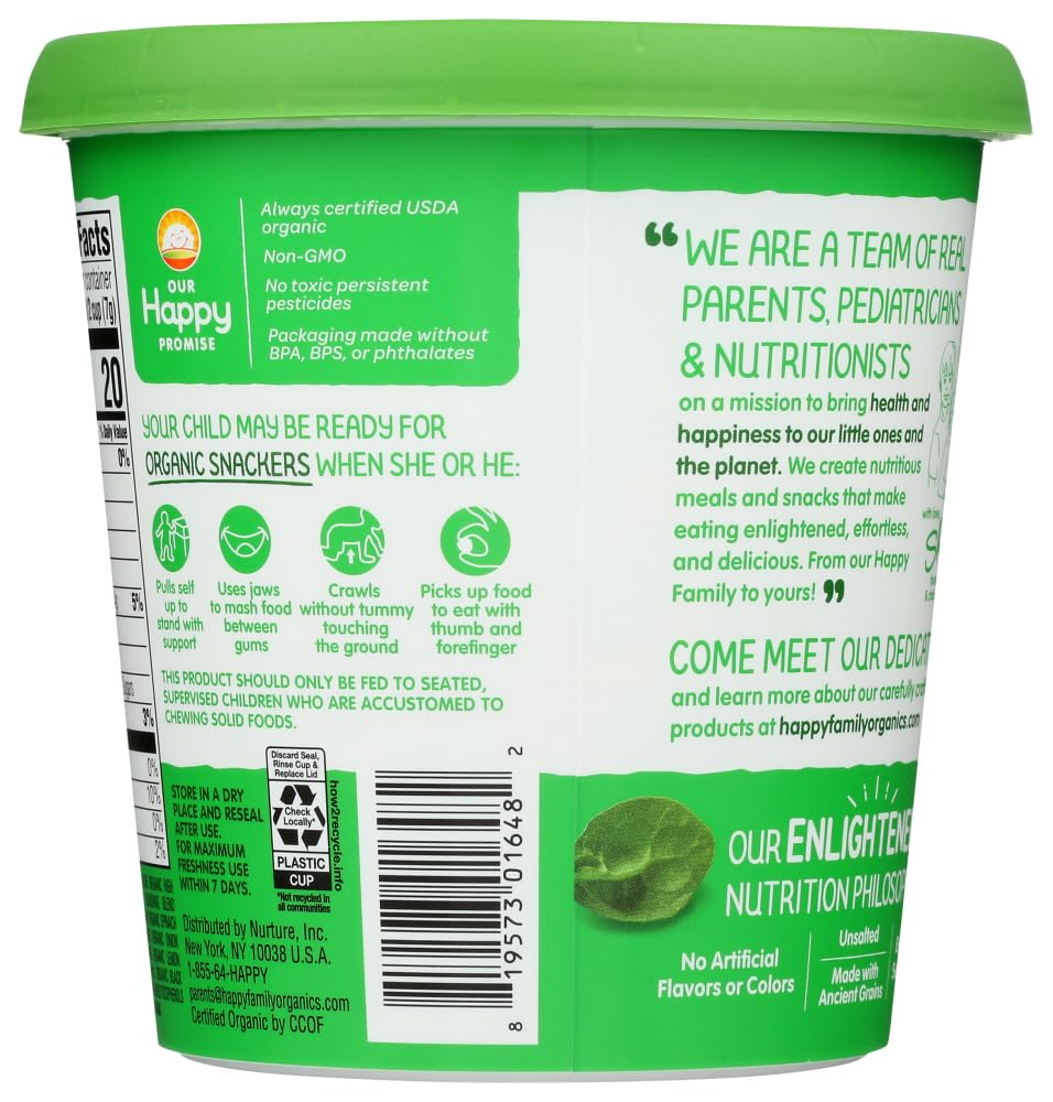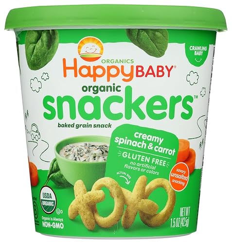 Q: Is the Happy Baby Snacker Cup suitable for toddlers?A: Yes, the Happy Baby Organic Baked Creamy Spinach & Carrot Snacker Cup is specifically designed for toddlers, making it a great snack choice for children who are beginning to explore new flavors and textures.