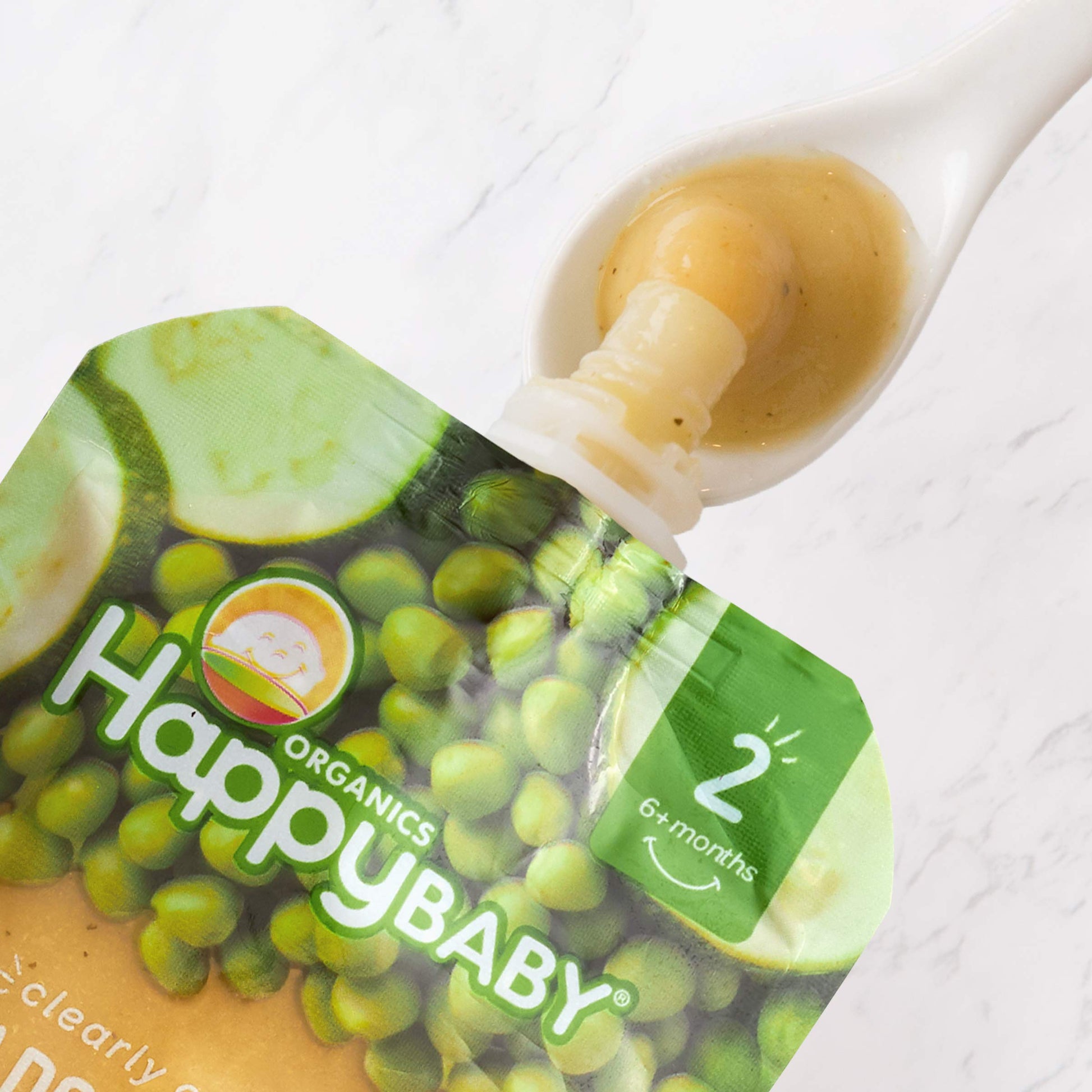 Q: What are the main ingredients in Happy Baby Organics Stage 2 Baby Food Pouches?A: Happy Baby Organics Stage 2 Baby Food Pouches primarily contain organic pears, zucchini, and peas, providing a nutritious blend of fruits and vegetables in a smooth puree.