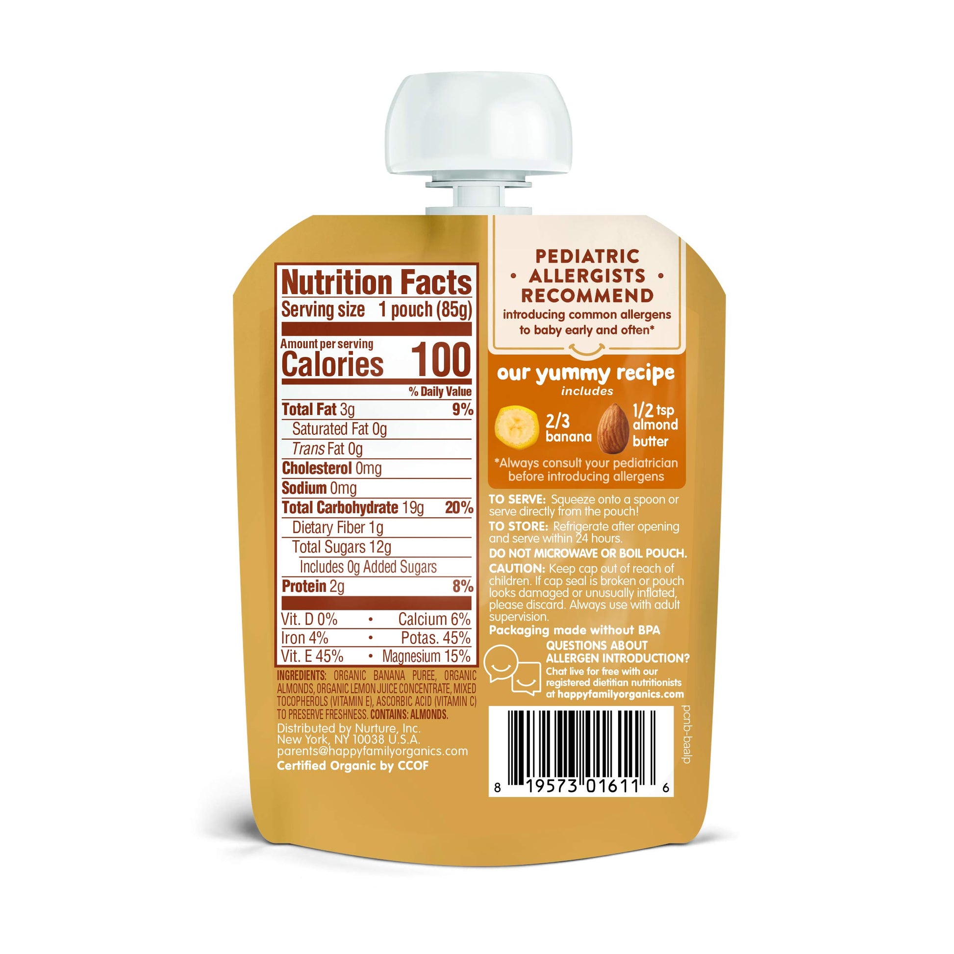 Q: What are the key ingredients in Happy Baby Organics Nutty Blends?A: Happy Baby Organics Nutty Blends include organic fruits along with 1g of peanut or tree nut protein, specifically designed for Stage Two eaters to explore new flavors.