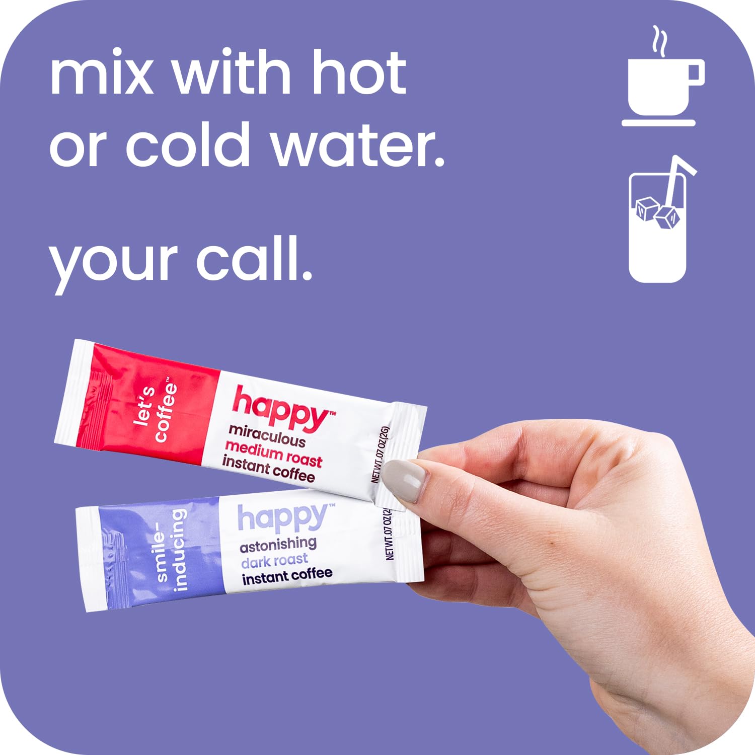 Let'S Coffee. Happy Instant Blends Have Char-Free Taste, Delivering Ultimate Smoothness. Now Thats Happy. Our 100% Arabica Beans Are Responsibly Grown And Harvested In South America, Then Carefully Roasted For A Sweet And Balanced Finish. Our Individual Coffee Packets Are Perfect For Rushed Mornings Or Stashing In Your Bag For An Afternoon Pick-Me-Up On The Go. Simply Pour Into A Cup Or Mug And Add Hot Or Cold Water (Yes, We Said Cold Too). Or Try With Hot Milk- Delish! Explore Our Full Line Of Happy, Including Ground And Whole Bean Coffee, Instant Coffee Packets, Pods, Lattes And Cold Brew.