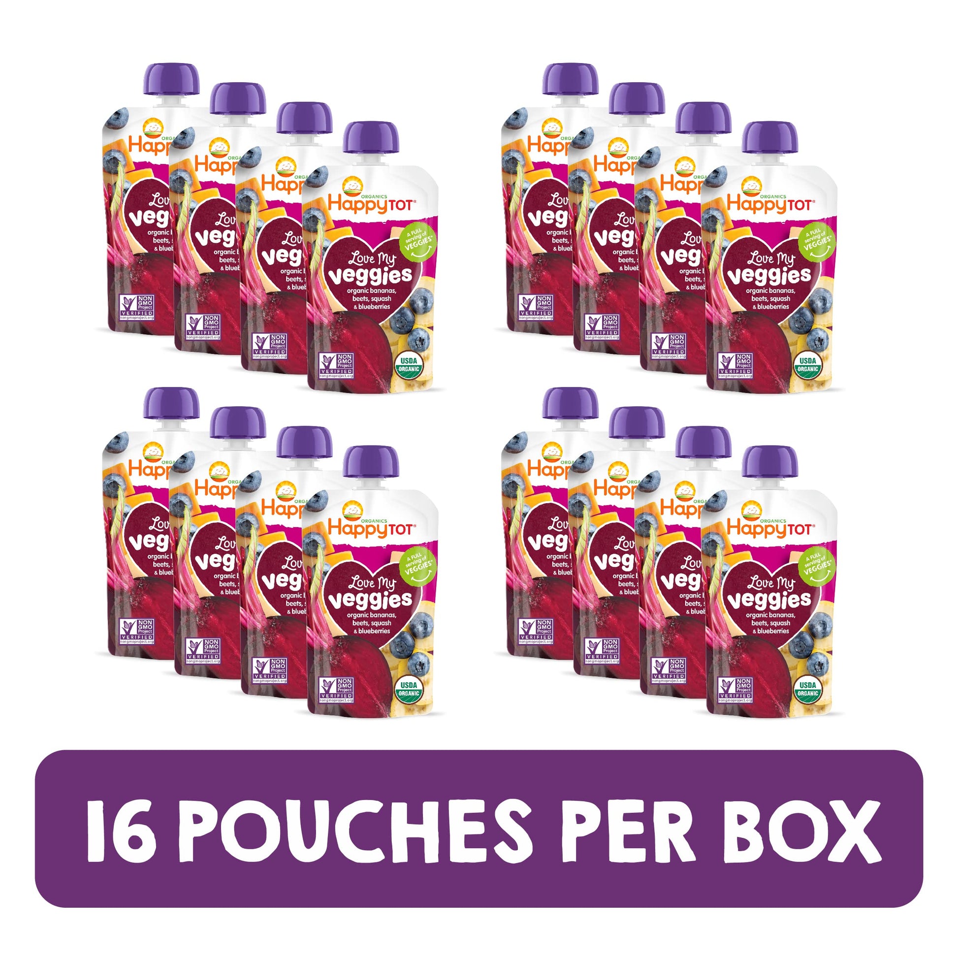 Q: What ingredients are in the Love My Veggies pouches?A: The pouches contain a blend of organic fruits and vegetables, including organic beets, squash, banana, and blueberries, ensuring a full serving of nutritious veggies and fruits in each pouch.