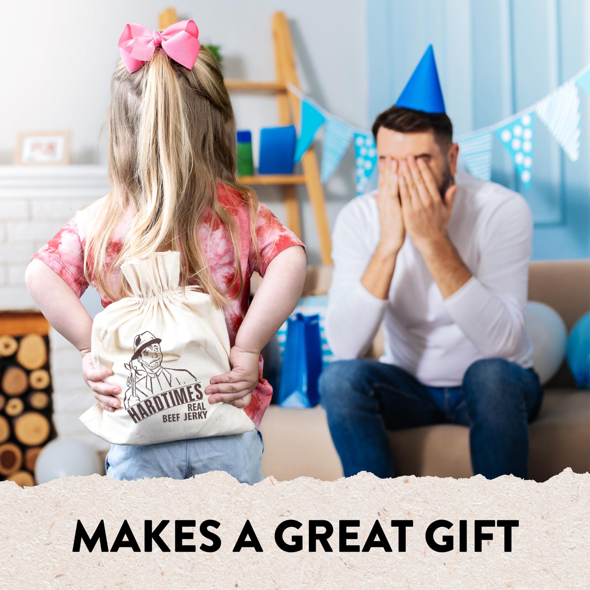 Q: What occasions is Hardtimes Beef Jerky a great gift for?A: Hardtimes Beef Jerky makes an exceptional gift for various occasions, including birthdays, Father's Day, holidays, and any special event, thanks to its specialty gift bag and delicious flavors.
