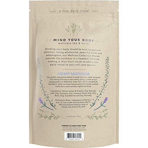 - Q: What are the main ingredients in Harney & Sons Hemp Moringa Deep Sleep Wellness Blend? A: The main ingredients in this blend include hemp leaves, organic Moringa leaf, organic turmeric, organic coconut pieces, organic Holy Basil, organic Goji berries, and organic nutmeg. These powerful herbs work together to promote relaxation and support a restful night's sleep.