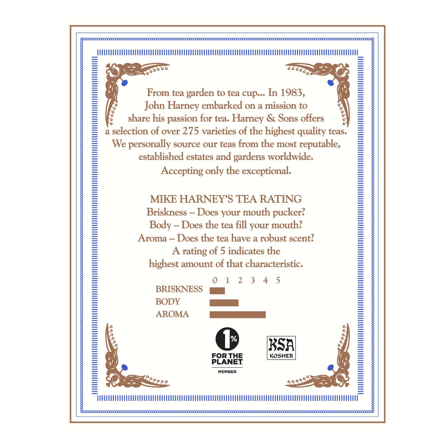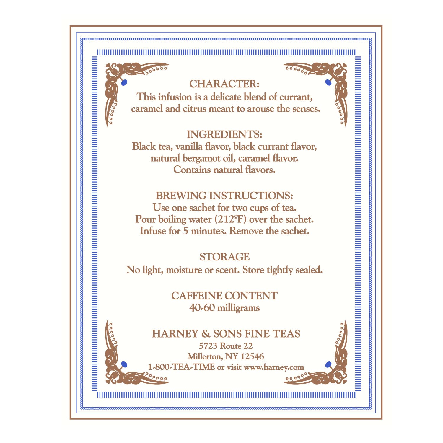 Q: What flavors can I expect from the Harney & Sons Paris Black Tea?A: The Harney & Sons Paris Black Tea features a delightful blend of fruity black tea with vanilla and caramel flavors, complemented by a hint of lemony Bergamot.