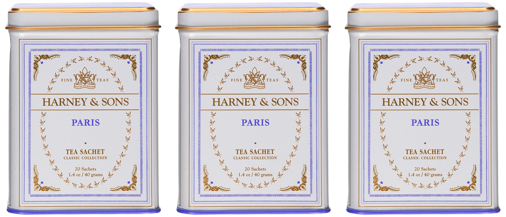 Q: What is the packaging size of the Harney & Sons Paris Black Tea?A: The Paris Black Tea is available in a classic tin containing 20 sachets, and this listing includes 3 packs for a total of 60 sachets.
