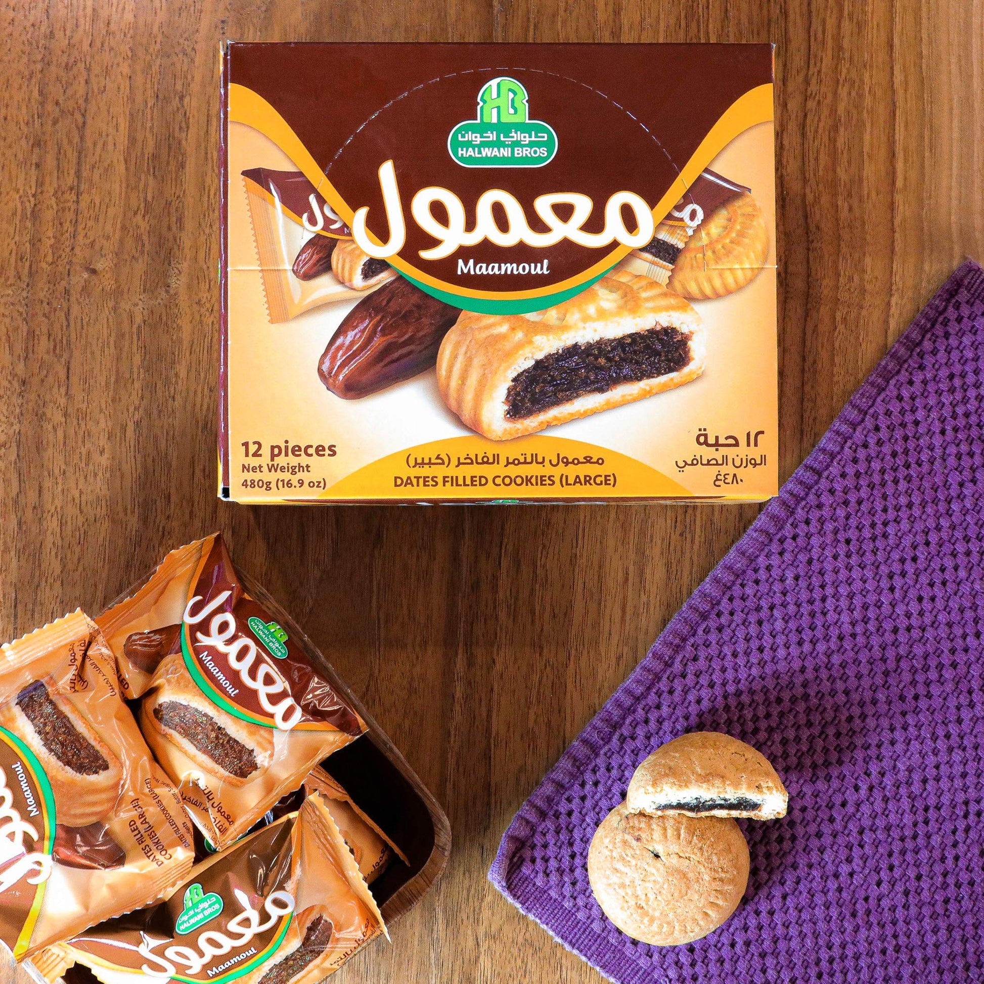 Q: How many cookies are in a box of HB Halwani Bros Cookies?A: Each box contains 12 maamoul date-filled cookies, perfectly sized for sharing or enjoying on your own.
