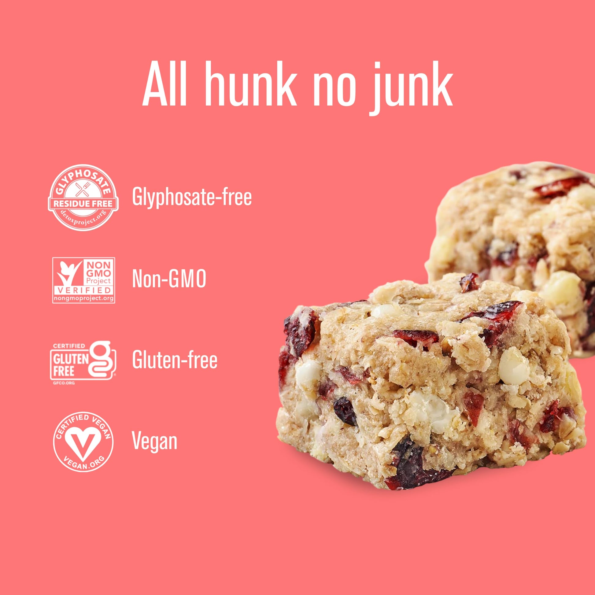 • Q: What are the main ingredients in Heavenly Hunks Cranberry White Chip? A: Heavenly Hunks Cranberry White Chip contains gluten-free whole rolled oats, chocolate chips, brown rice syrup, sustainably sourced palm oil, coconut shreds, sorghum flour, tapioca flour, potato starch, cane sugar, and sea salt. These real ingredients ensure a delicious and guilt-free snack.
