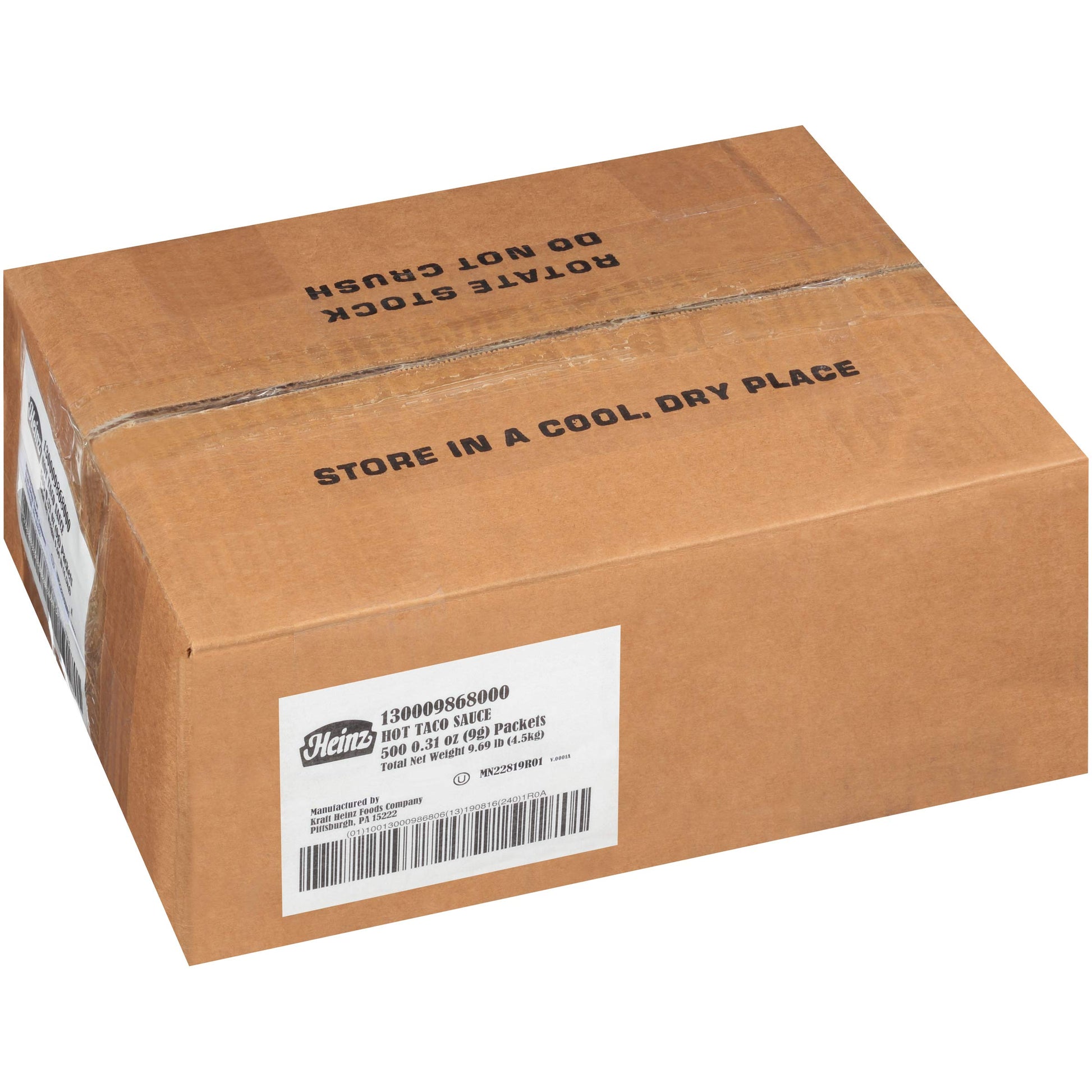 Q: What size are the Heinz Hot Taco Sauce packets?A: Each Heinz Hot Taco Sauce packet is 0.3 ounces, making it a convenient size for single servings.