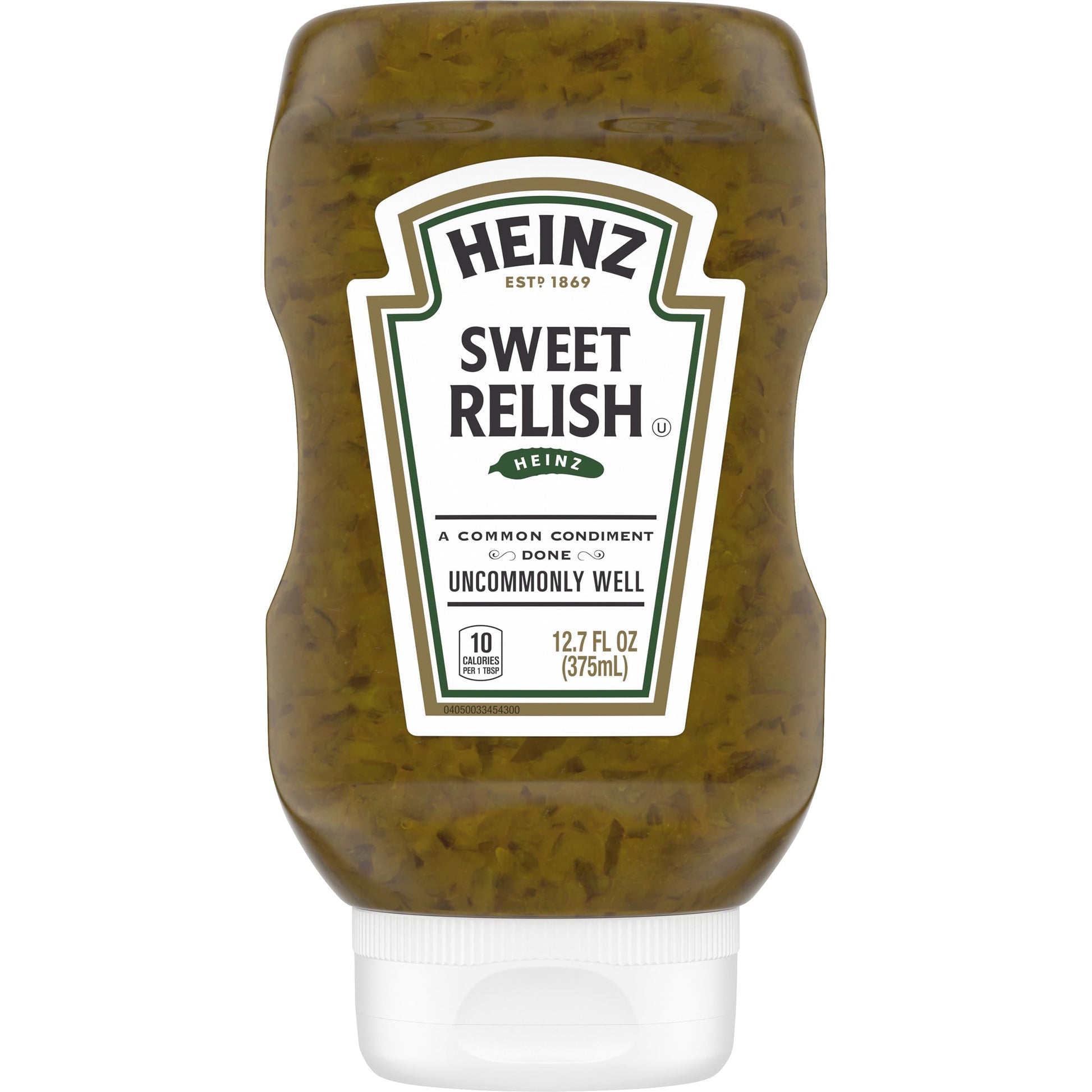 Featuring crunchy pickled cucumber and cabbage immersed in vinegar, Heinz Sweet Relish will help you create flavors that complement any dish. With pieces of red bell pepper and extracts of turmeric, our 12.7 fluid ounce bottle of Heinz Sweet Relish will add a completely new dimension of flavors to your favorite dish. Our relish is prepared with care so that every bottle has the perfect ratio of ingredients to complement your favorite foods. Just drizzle our relish on top of hot dogs or burgers or use it as a dip and the crunch from cucumbers and cabbage will add life to any meal.
