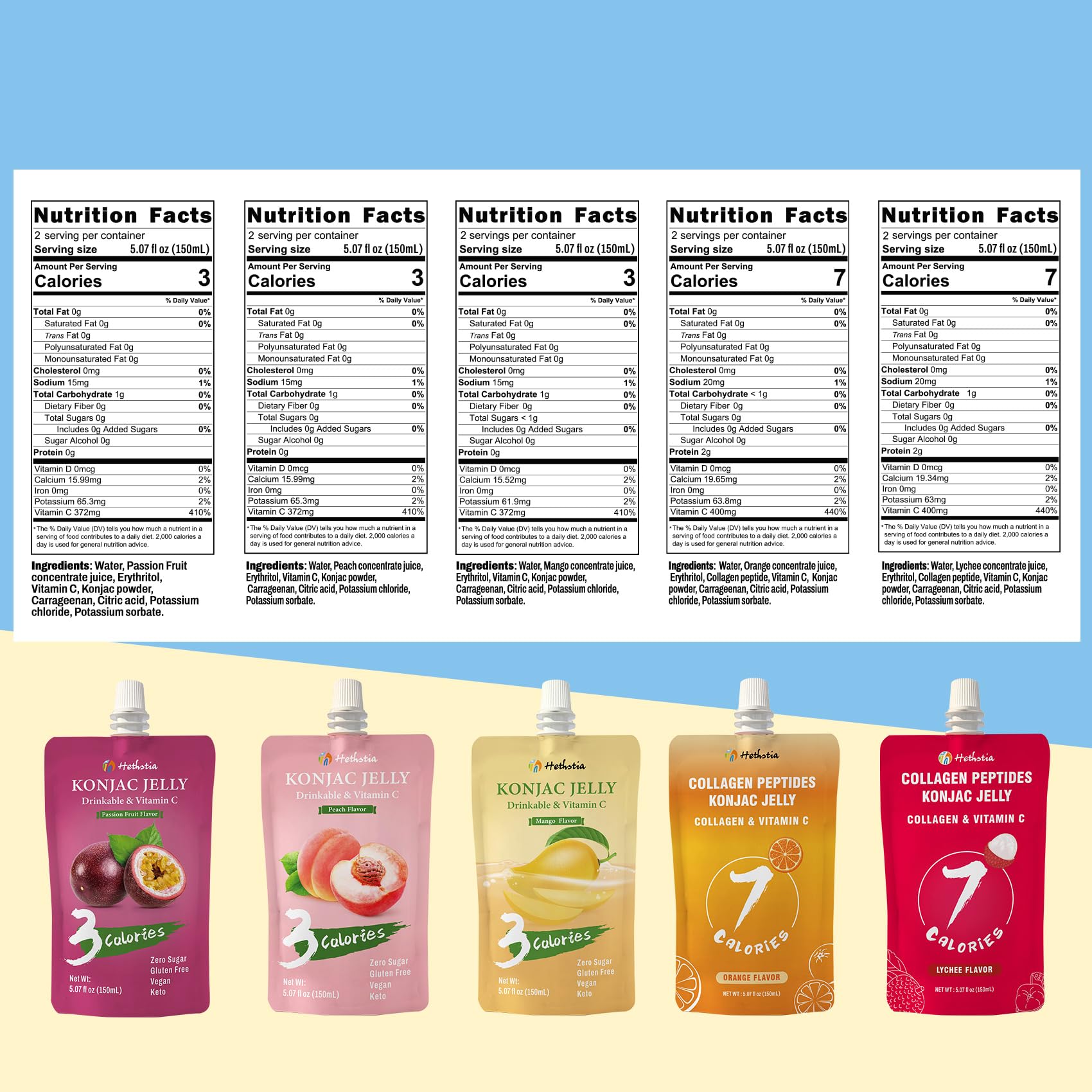 View compareHethstia Konjac Jelly Drinkable Pouch Variety Pack - Low Calorie, 0 Sugar, Gluten-Free, Collagen Peptides & Vitamin C - 10 Pack