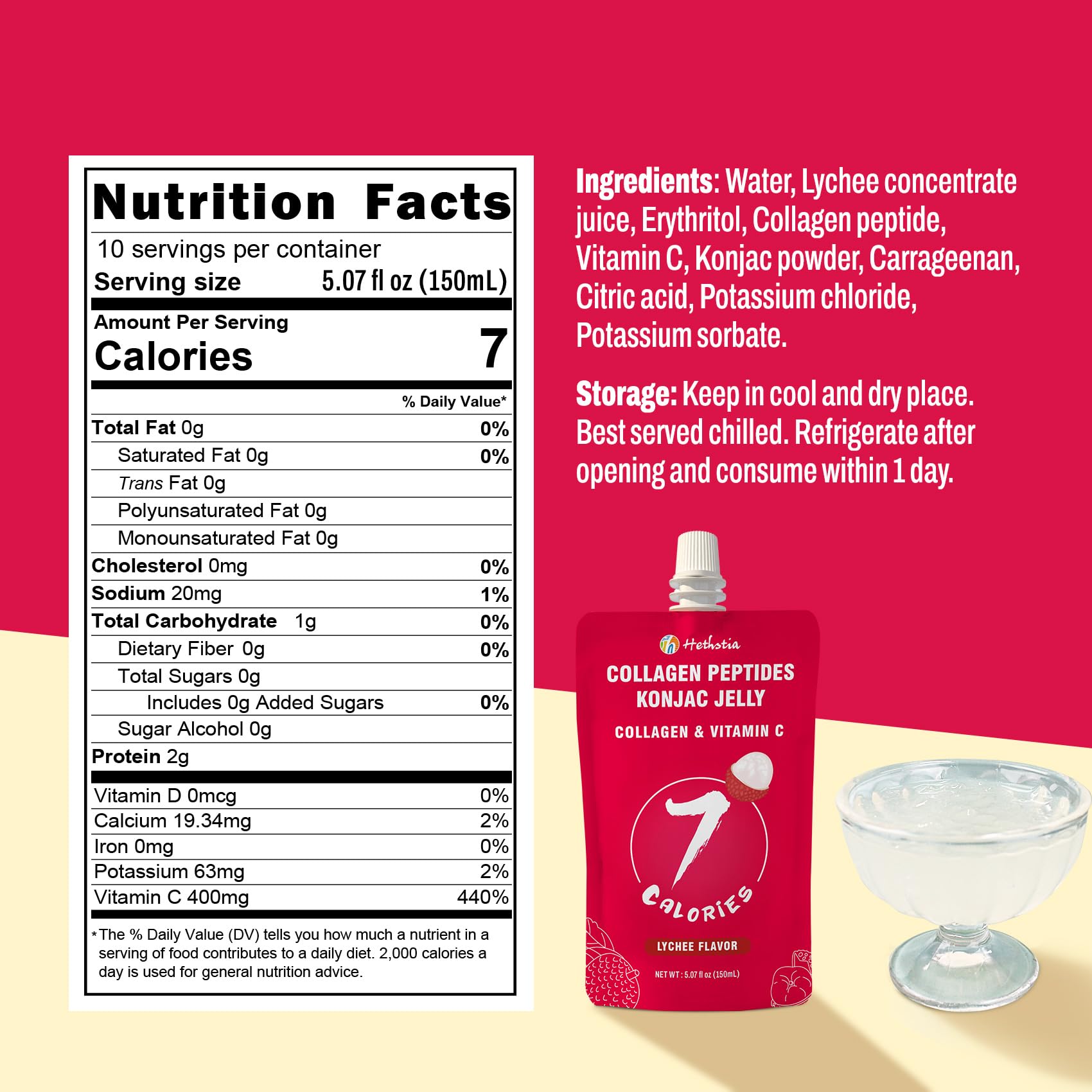 Hethstia Konjac Jelly Squeeze Pouch Lychee Flavor, 10 Packs, 7 Calories, Sugar Free, Gluten Free, Keto, Collagen Peptides, Vitam