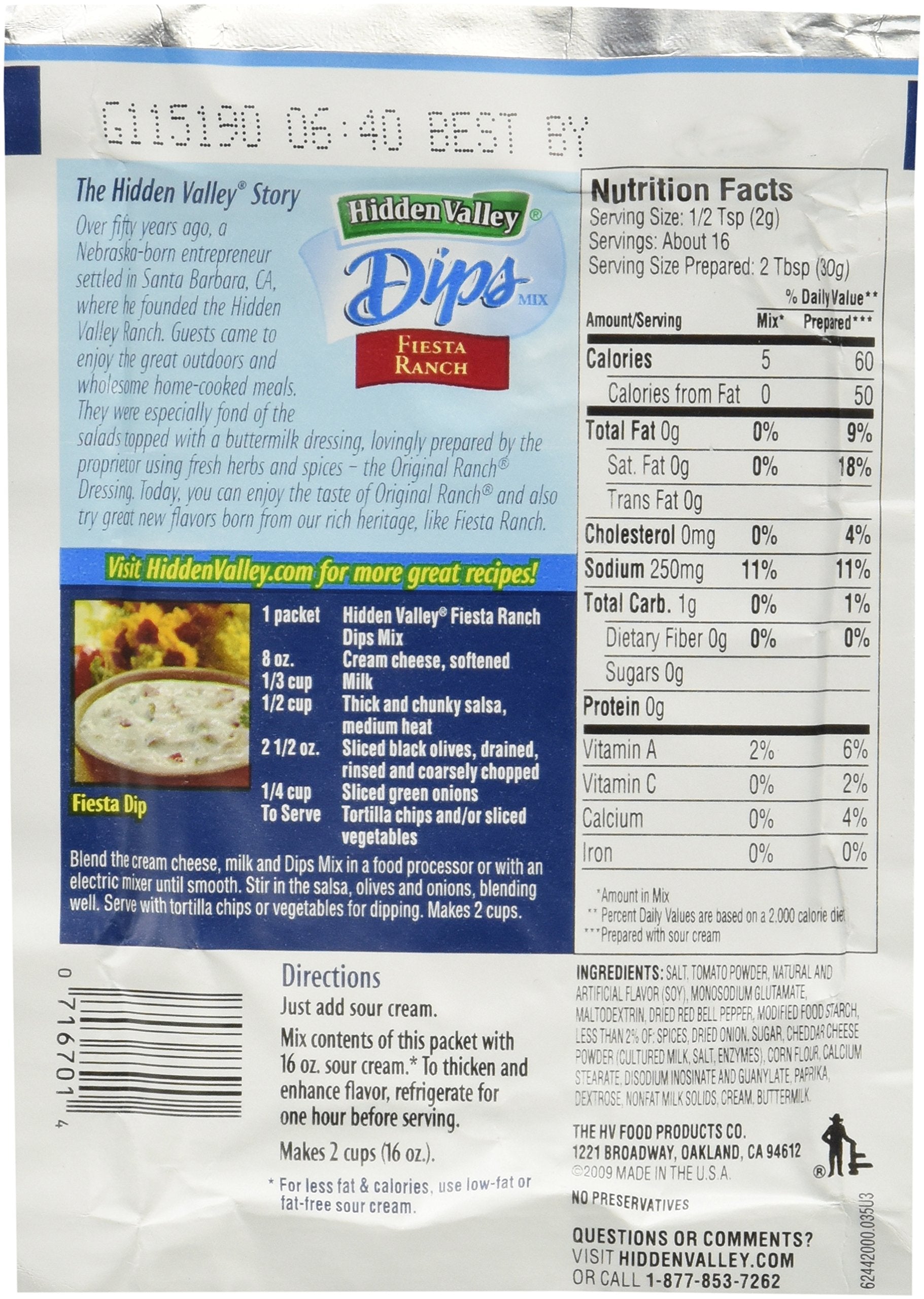 Hidden Valley Dips Mix, Fiesta Ranch, makes a delicious, zesty dip for easy party appetizers and tasty snacks. Simply stir the dry ingredients of the packet into sour cream and serve with cut vegetables, crackers or chips. Get creative and combine this gluten free dip mix with softened cream cheese, thick and chunky salsa, sliced black olives, and green onions for extra flavor and crunch. This zingy dip is the perfect way to add a little spice to every get together. Make everything taste better with Hidden Valley.