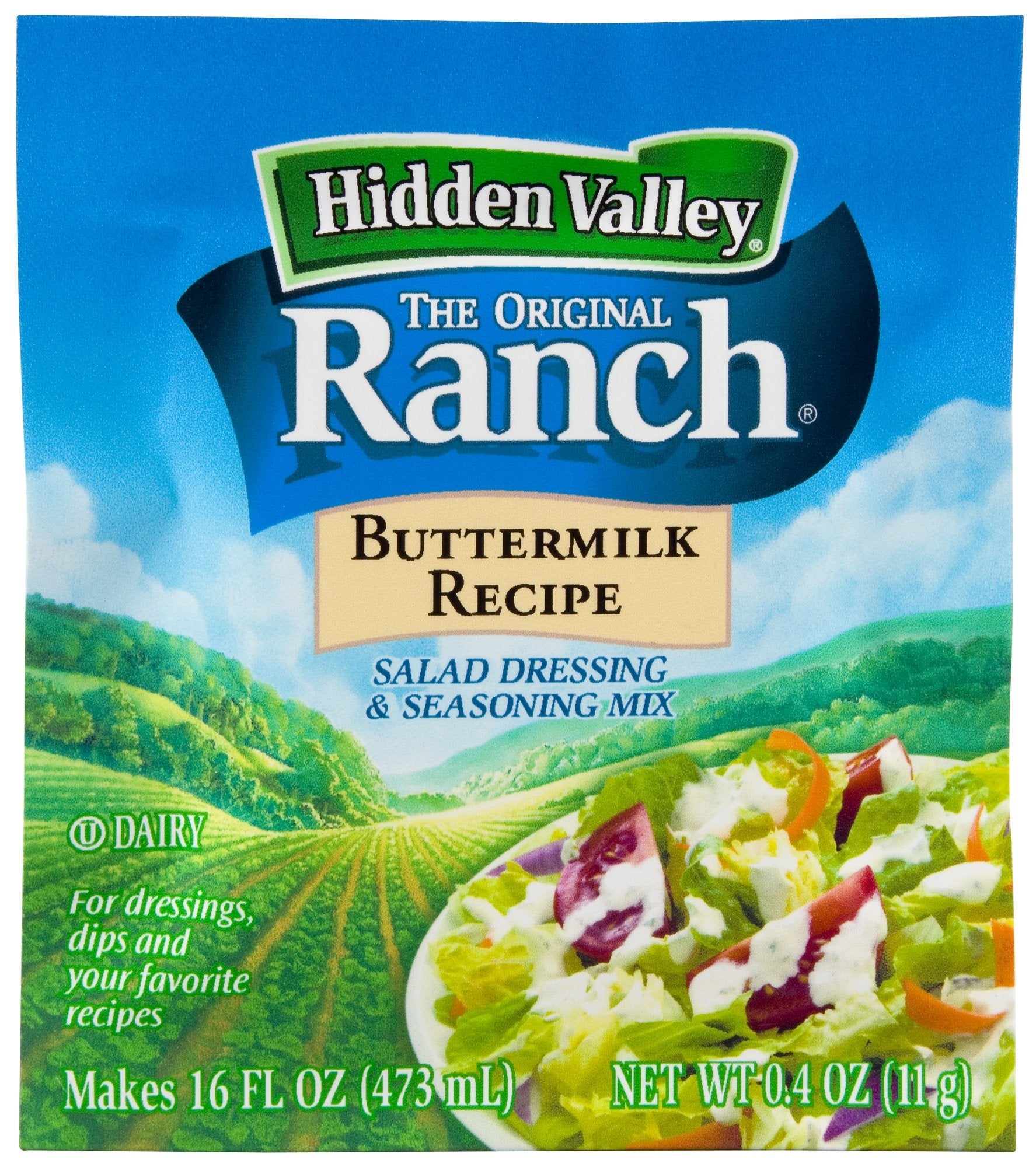 Make Ranch Dressing With The Taste Of Old-Fashioned Buttermilk Or Add A Twist To Quick Meals. With Versatile Hidden Valley Original Ranch Salad Dressing And Seasoning Mix In Buttermilk Recipe, You Can Make Creamy Ranch Dressing With Tangy Buttermilk Flavor, Or Come Up With New Dinner Ideas That The Whole Family Will Love. Simply Add The Contents Of The No-Measure Packet To Buttermilk And Mayo For A Fresh Salad Topping That Tastes Great With Greens, Vegetables, Or Potato Salad. For Quick Meals, Mix With Ground Beef And Cheddar Cheese And Form Patties For Mouthwatering Burgers. Or Add This Gluten-Free Mix To The Filling Of A Twice-Baked Potato For An Easy Side Dish. You Can Even Use It To Make A Thick And Tasty Dip. Just Add Sour Cream, And Serve With Cut Veggies For A Tasty Snack. Get A Great Value With This Convenient Pack Of Four, 0.4-Ounce Packets. Make Everything Taste Better With Hidden Valley.