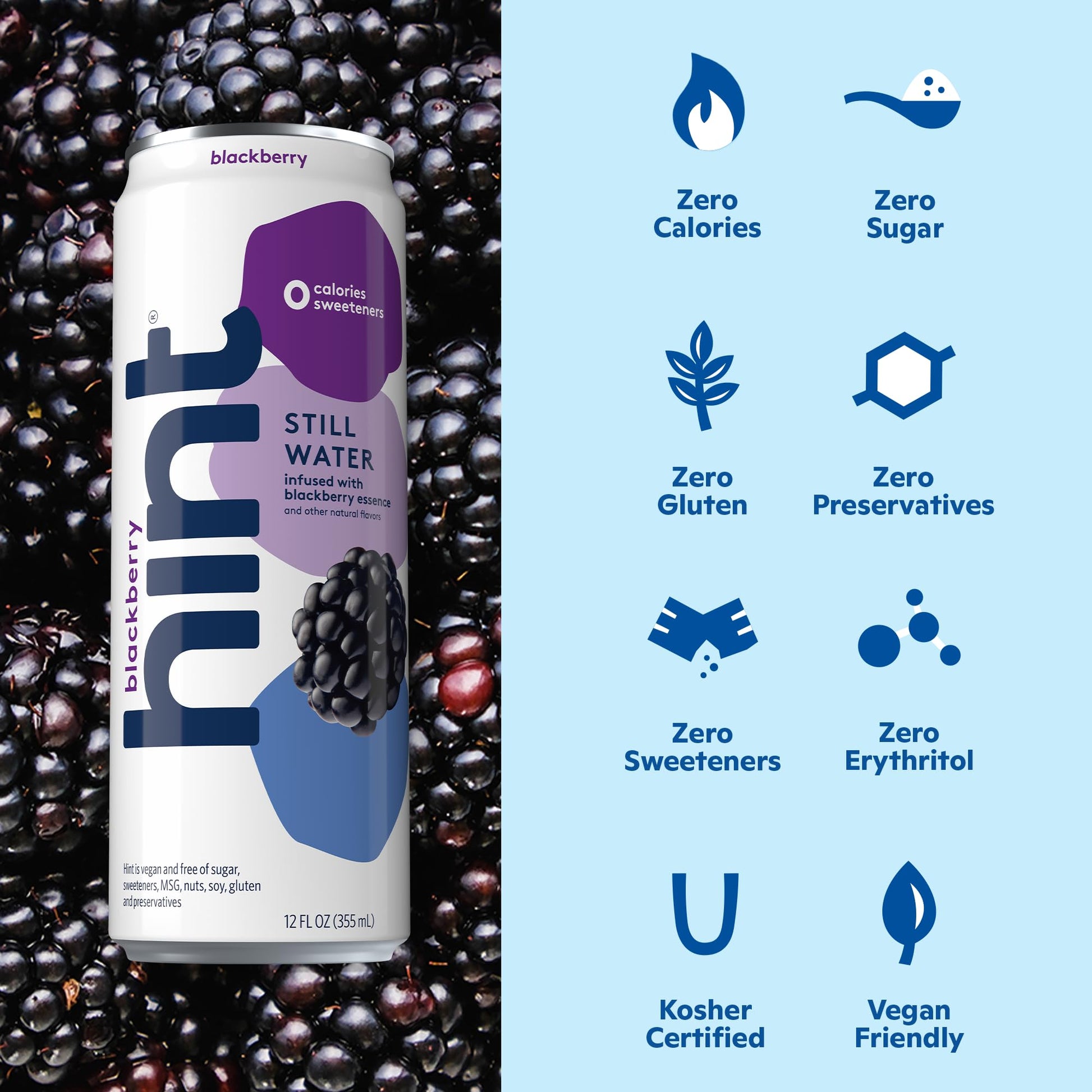 Q: What is Hint Fruit-Infused Canned Water?A: Hint Fruit-Infused Canned Water is a refreshing flavored water beverage that combines pure still water with natural fruit essences, like blackberry, providing a delicious hydration option without any sugar, sweeteners, or calories.