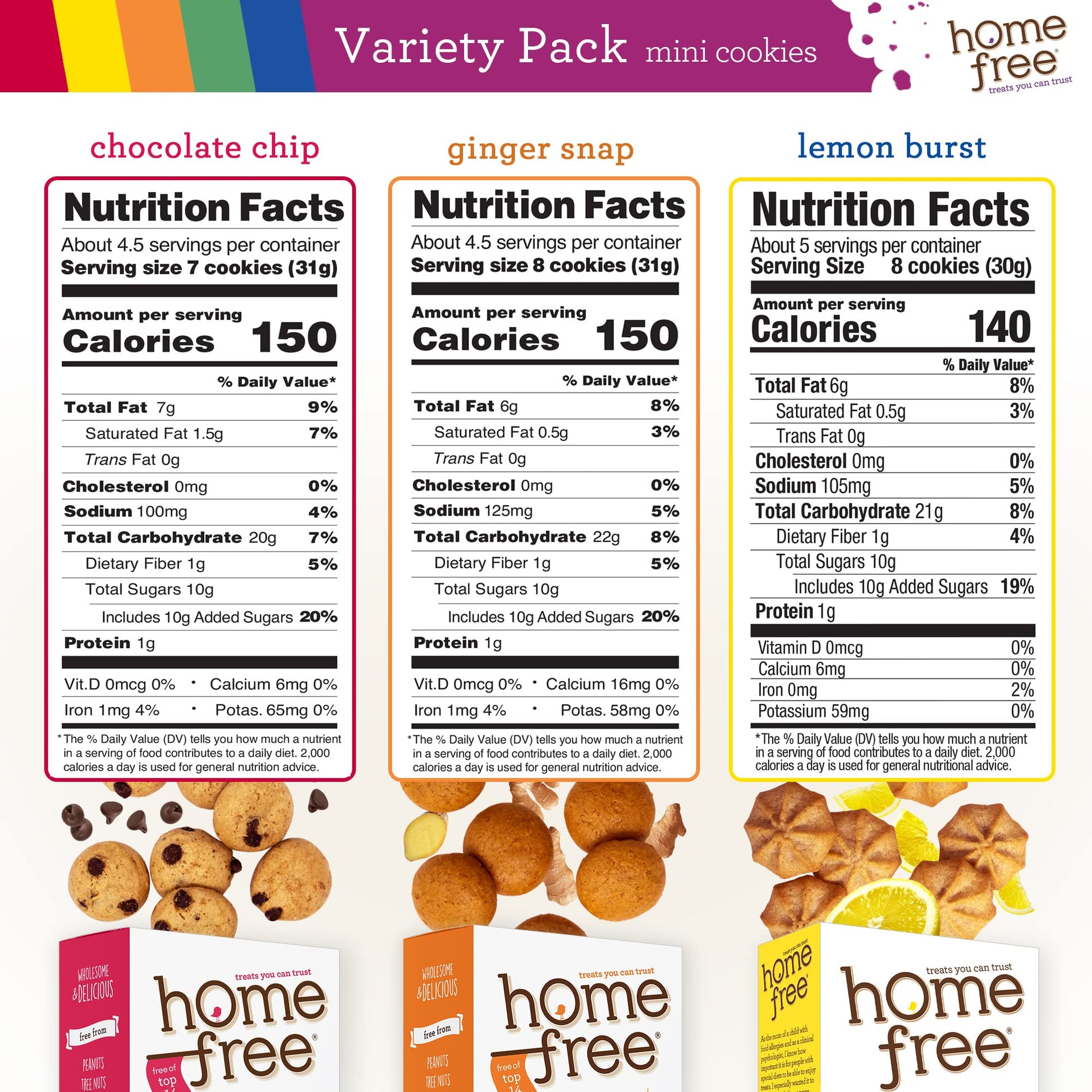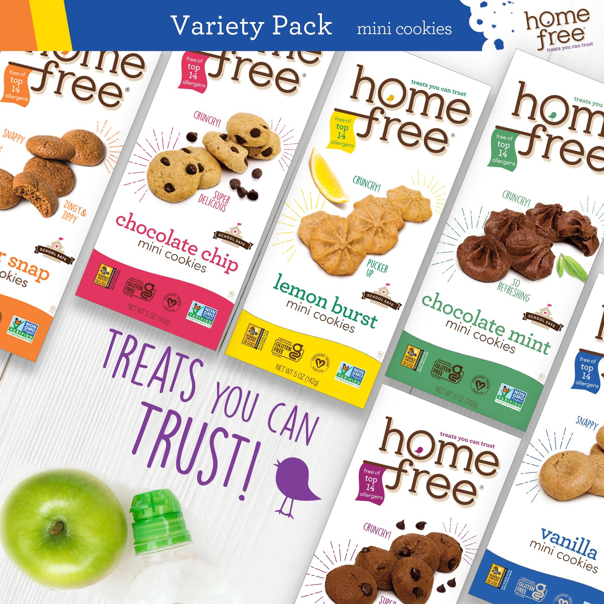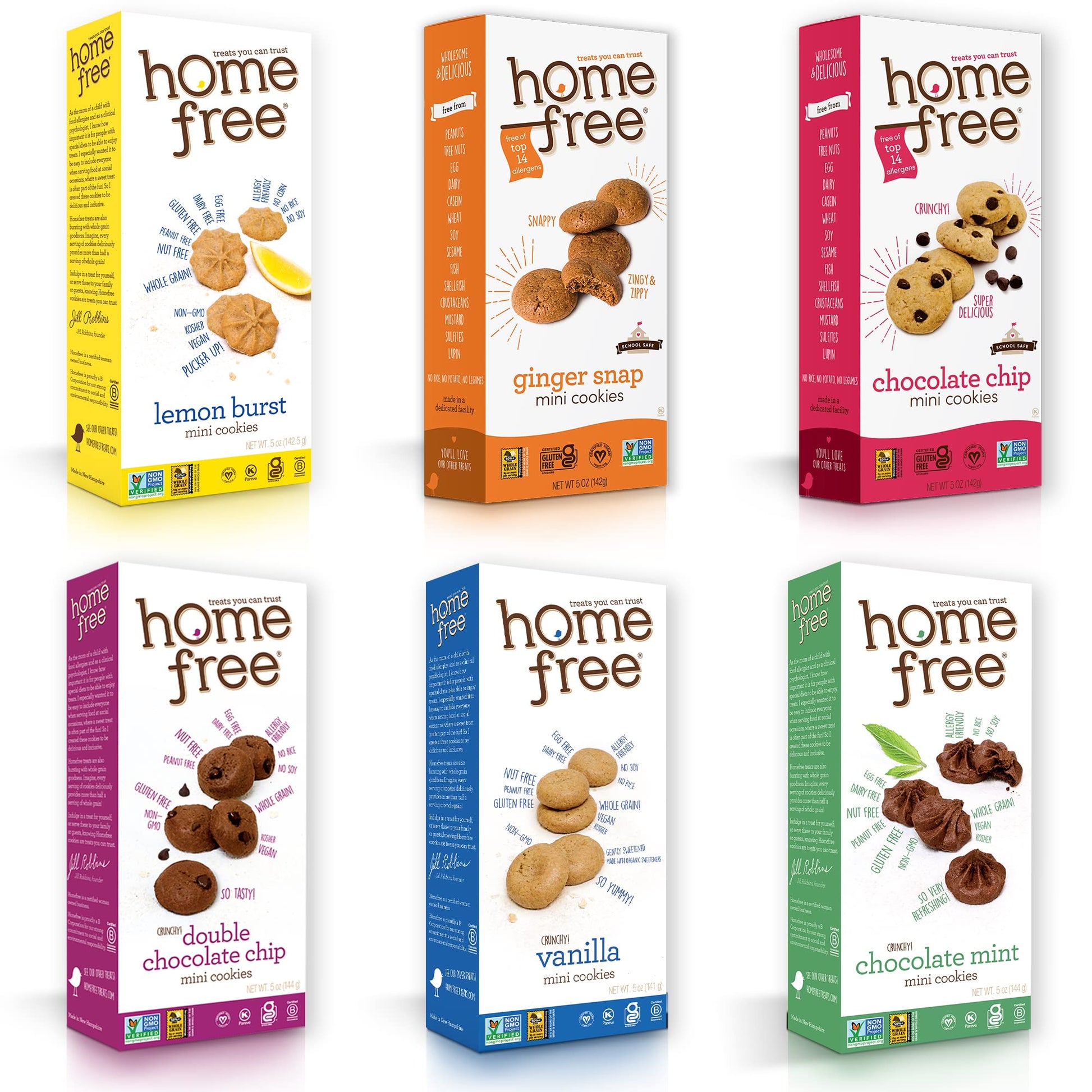 Allergy Friendly Cookies: Deliciously crunchy cookies in a multi pack of 5 oz boxes: one Chocolate Chip, one Double Chocolate Chip, one Lemon Burst, one Ginger Snap, one Vanilla Wafer, one Mint Chocolate; Snap ebt eligible snacks | Six Favorite Flavors: Not sure which Homefree flavor is your favorite? Try our cookie box sampler; Stock the pantry with yummy cookies for your family; Or send a fun care package of allergy safe snacks to college or sleep-away camp | School Safe Snacks: Allergy-conscious, vegan cookies baked in a dedicated nut-free, gluten-free facility; They're scrumptious and peanut free for school; Share freely at kids classroom party, school lunch, playdate or soccer game | Nutritious Treats: Homefree cookies are mom-made with trusted non-GMO ingredients; A handful of wholesome cookies holds more than 1/2 serving of whole grains; With no trans fats, no cholesterol, no palm oil, no high fructose corn syrup | Treats You Can Trust: Every allergy-friendly cookie is crafted with the highest standards of care to ensure safety and quality, offering delicious treats you can feel good about
