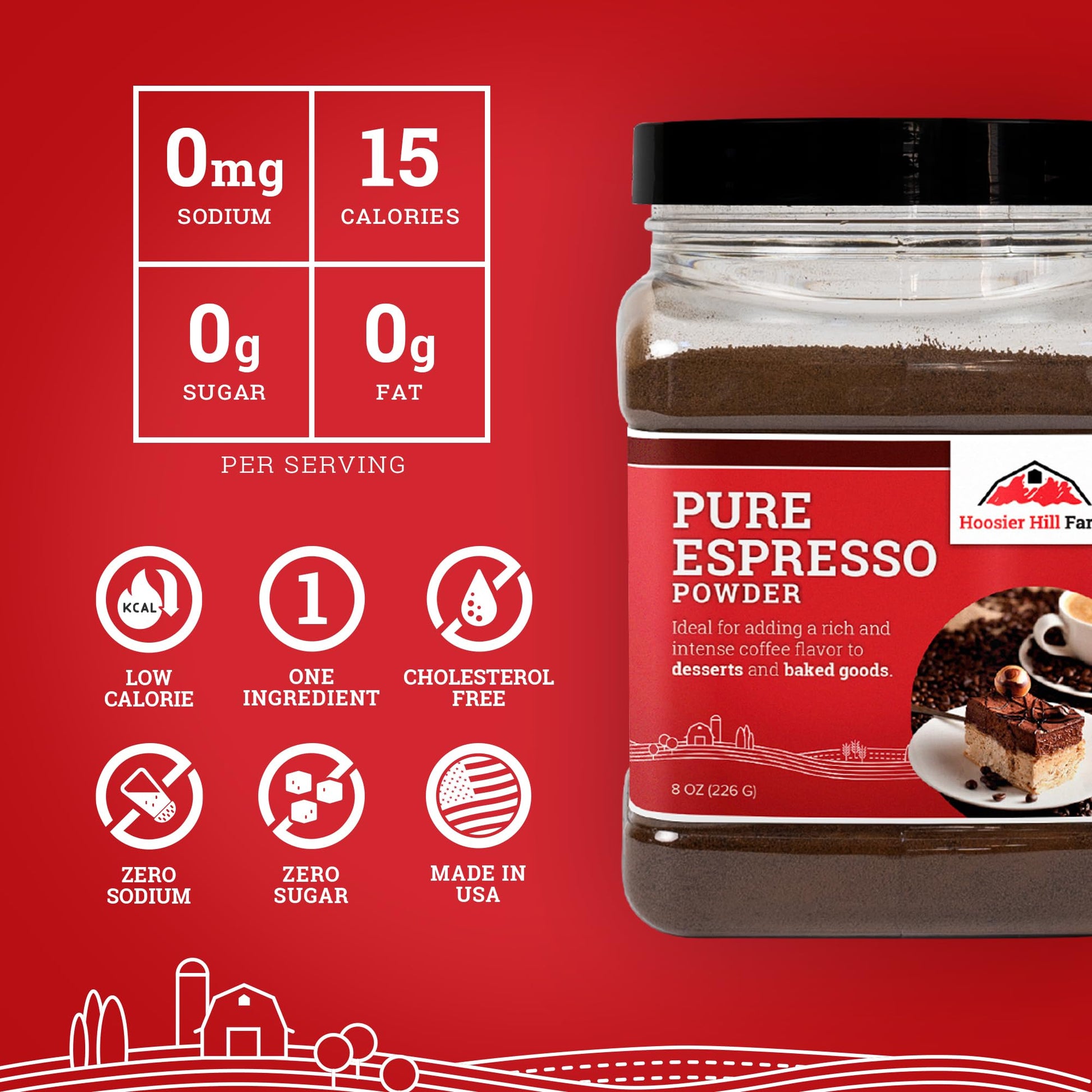 Q: What is the size of the packaging for Pure Espresso Powder?A: Pure Espresso Powder is available in an 8-ounce package. This size is ideal for home bakers and coffee enthusiasts looking to add a concentrated coffee flavor to their culinary creations.