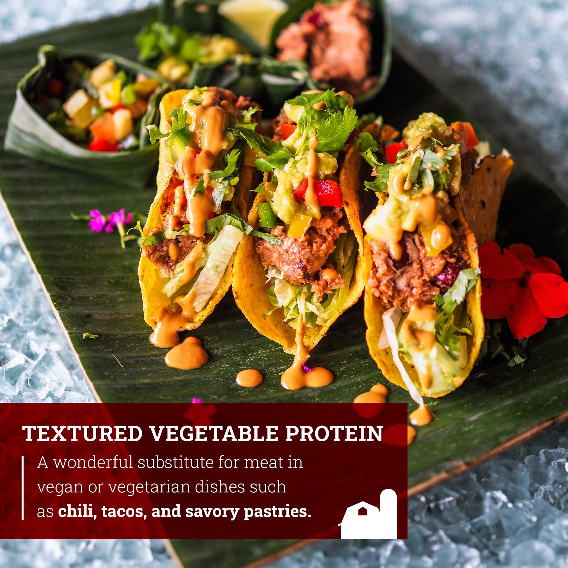 Textured Vegetable Protein Is A Rich, Nutritious Soy Product And A Great Alternative To Meat. High In Fiber And Protein, Textured Vegetable Protein Absorbs Flavors In Recipes And Sauces. Try It In Vegan Chili, Sprinkled Over Soups And Salads, Or Use It To Make A Plant-Based Bolognese Sauce. Reconstitute By Mixing 1 Part Textured Vegetable Protein To 1 Part Hot Water Or Broth. Let Soak 5-10 Minutes. Refrigerate Reconstituted Mixture If Not Used Right Away. Store In A Cool, Dry Place. We Do Not Recommend Refrigeration Or Freezing Of The Textured Vegetable Protein. Allergens: Contains Soy. Packaged In A Facility That Processes Dairy, Soy, Peanuts, And Wheat Products.