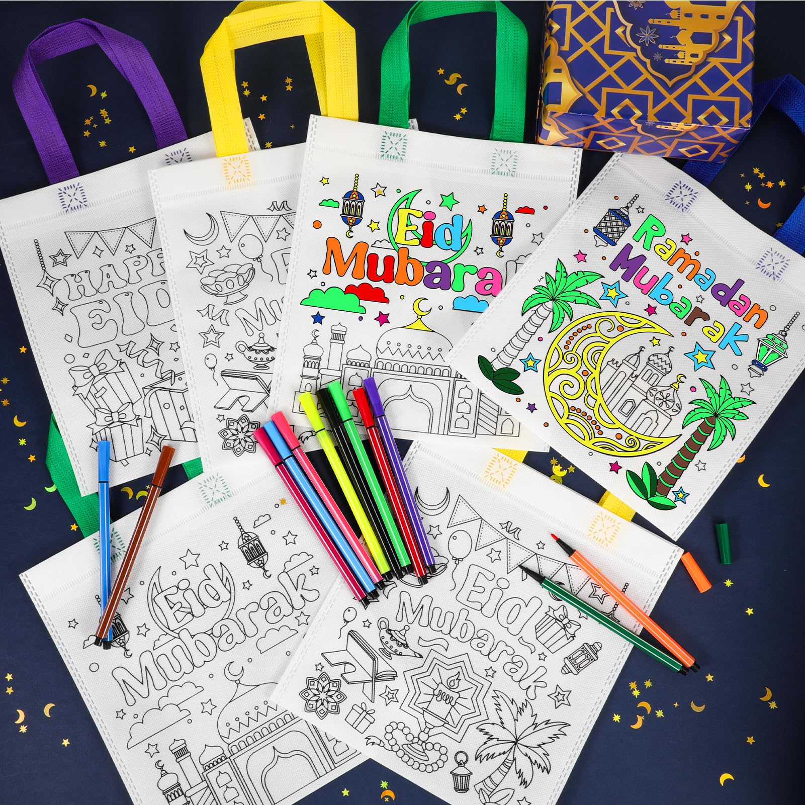 Eid Mubarak! Want To Have A Wonderful And Fulfilling Eid Holiday Diy Eid Mubarak Craft Non Woven Bags For Kids Will Be A Good Choice! Children Can Decorate Their Own Ornaments; Diy Mosque Scene Bags For Kids Could Show Your Kids Creativity And Cultivate Their Handling Ability, Which Will Make Muslim Decorations Interesting And Distinctive Ramadan Party Favors Kids Coloring Tote Is Printed Clearly, Your Children Can Color Patterns Along The Lines Package Include: 12Pcs * Eid Mubarak Graffiti Bag Non-Woven Tote Bags 24Pcs * Coloring Pens Specification: Material: Polyester Non-Woven Fabric Color: Blank