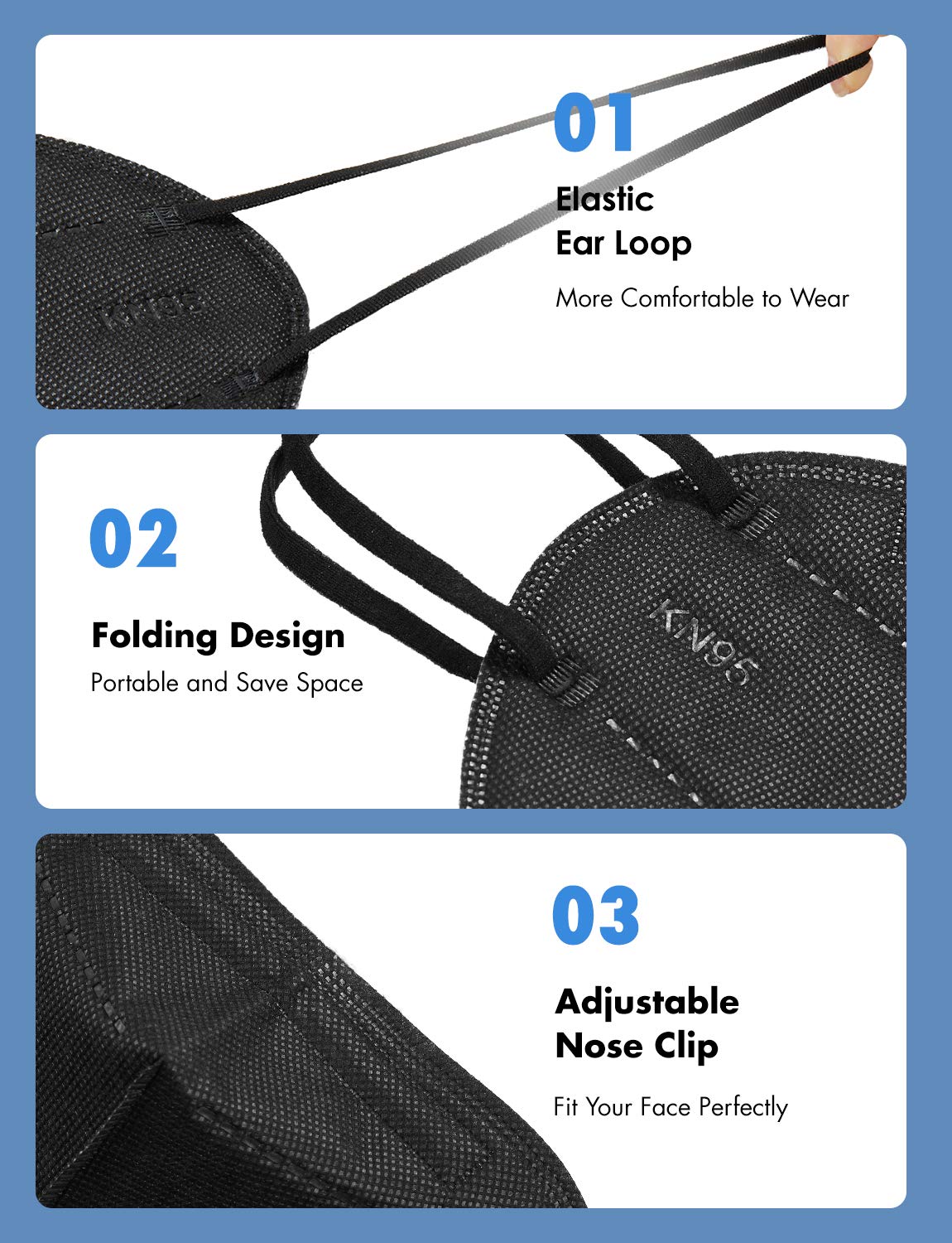 5-Ply Protective: This mask is made of 2 non-woven outer layers, 2 melt-blown inner filter, 1 non-woven fabric middle layer absorbing the moisture. | 3D Design: Black face mask for adults has unique point-shaped forming technology, bigger cup design help against particles & breathe smoothly | High Filtration: The minimum filter efficiency is 95%, greatly keeping you from dust, PM 2.5, haze, smoke, automobile exhaust, etc. Perfect For families, office staff, warehouse workers | Comfortable & Breathable: High-elastic ear loops and adjustable nose clip to ensure a comfortable fit and no strain of ears. It's lightweight and foldable, can cover mouth, nose and chin easily | Disclaimer: This KN95 mask is NOT an N95 mask. For more information about KN95 masks please see the following before you purchase: amazon.com/AboutKN95s.