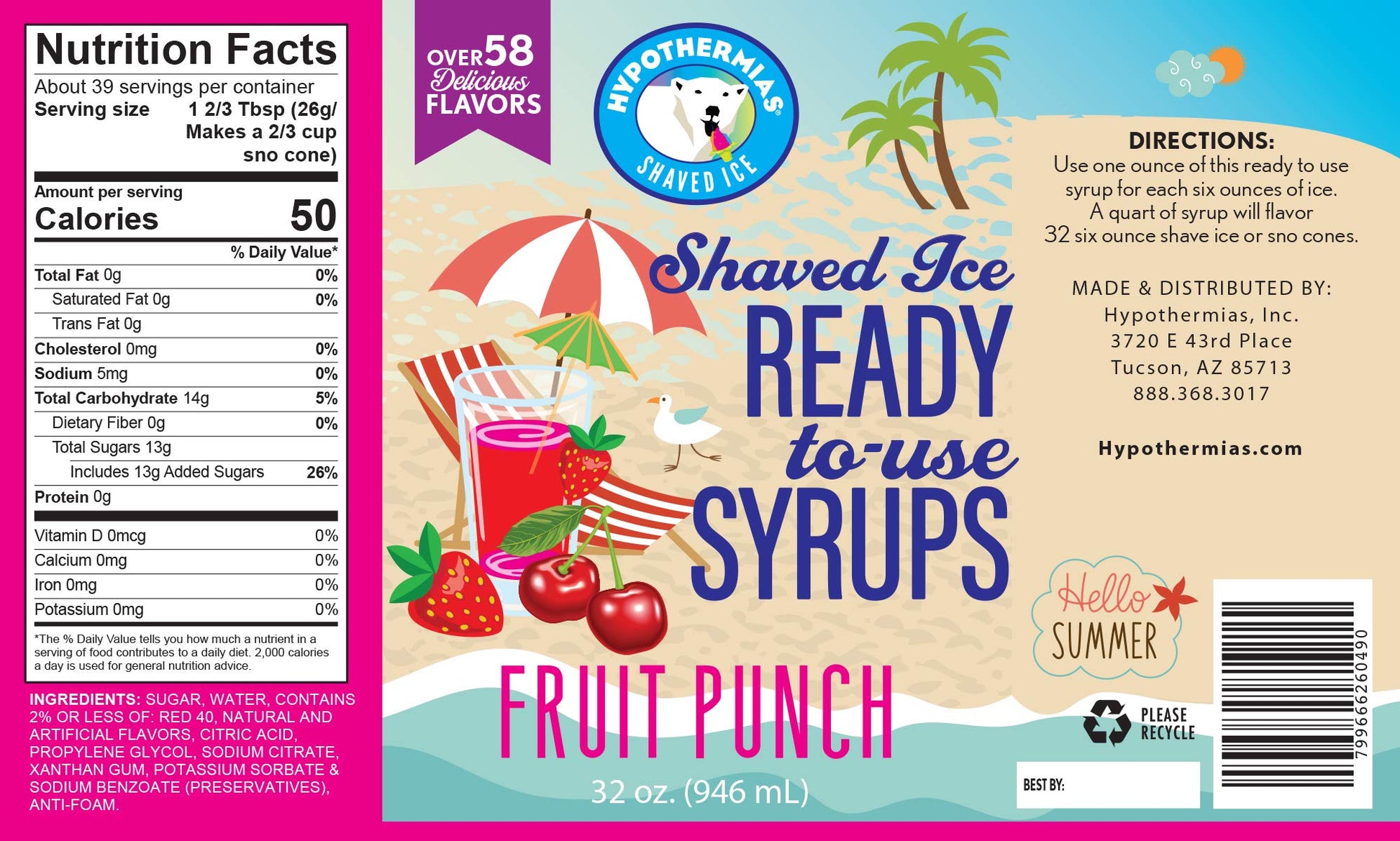 - Q: What are the main ingredients in Hypothermias Fruit Punch Syrup? A: Hypothermias Fruit Punch Syrup is made from non-GMO, 100% pure cane sugar and reverse osmosis water, ensuring a high-quality flavor without any corn syrup.