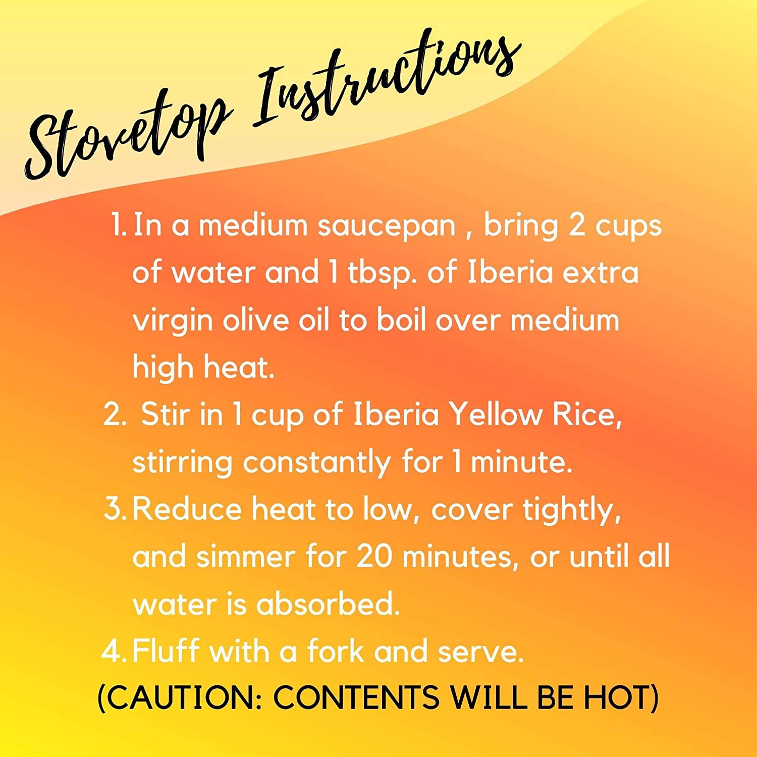 SIMPLE TO PREPARE: Iberia Yellow Rice is simple to prepare, cooks to fluffy perfection every time, and presents a beautiful complement to a range of meats and vegetables.