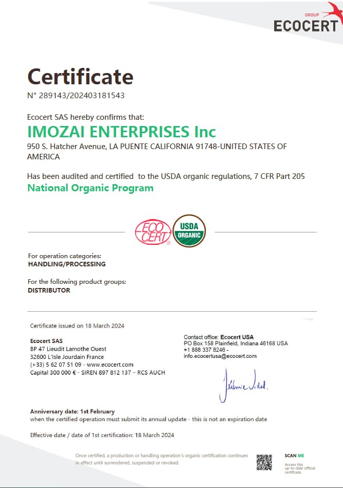 Q: Is Imozai Organic White Tea certified organic?A: Yes, Imozai Organic White Tea is USDA Certified Organic and Non-GMO, ensuring that you are consuming a high-quality and natural product.