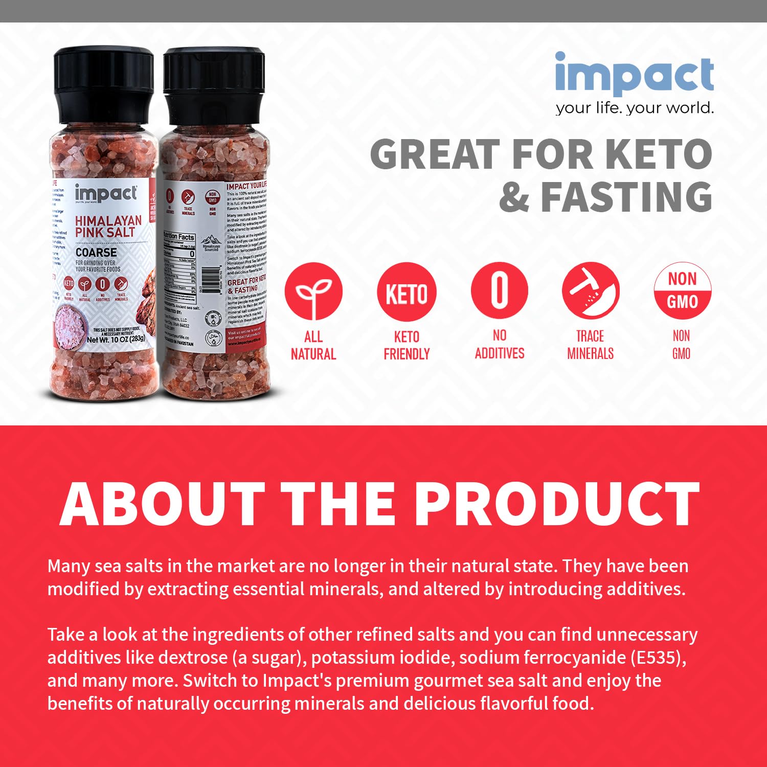 Discover the pure essence of the Himalayas with our Impact Himalayan Pink Sea Salt, a pristine salt harvested from ancient mineral-rich deposits. Free from additives or artificial ingredients, it offers a source of essential minerals like calcium, magnesium, potassium, and iron, fostering hydration and electrolyte balance for overall well-being. Ideal for keto and fasting regimens, its mineral-rich composition supports metabolic processes and provides vital nutrients for sustained energy. Packaged in a convenient 10 oz Grinder, its coarse texture ensures effortless seasoning for all your culinary adventures, from meats and vegetables to baked goods and gourmet dishes. Elevate your cooking with the versatile and nourishing touch of Himalayan pink sea salt.