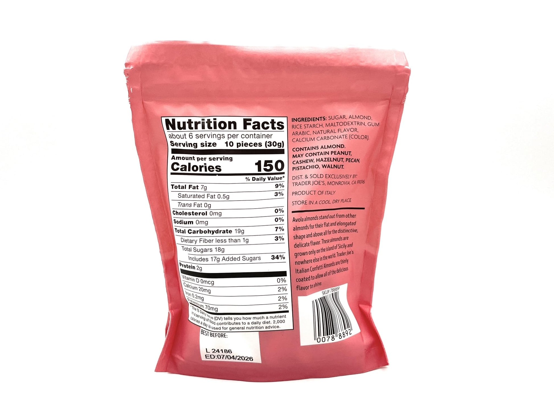 Q: What is the packaging size for this product?A: The product comes in a pack of 2, with each package containing 6oz (170g) of Italian Confetti Almonds.