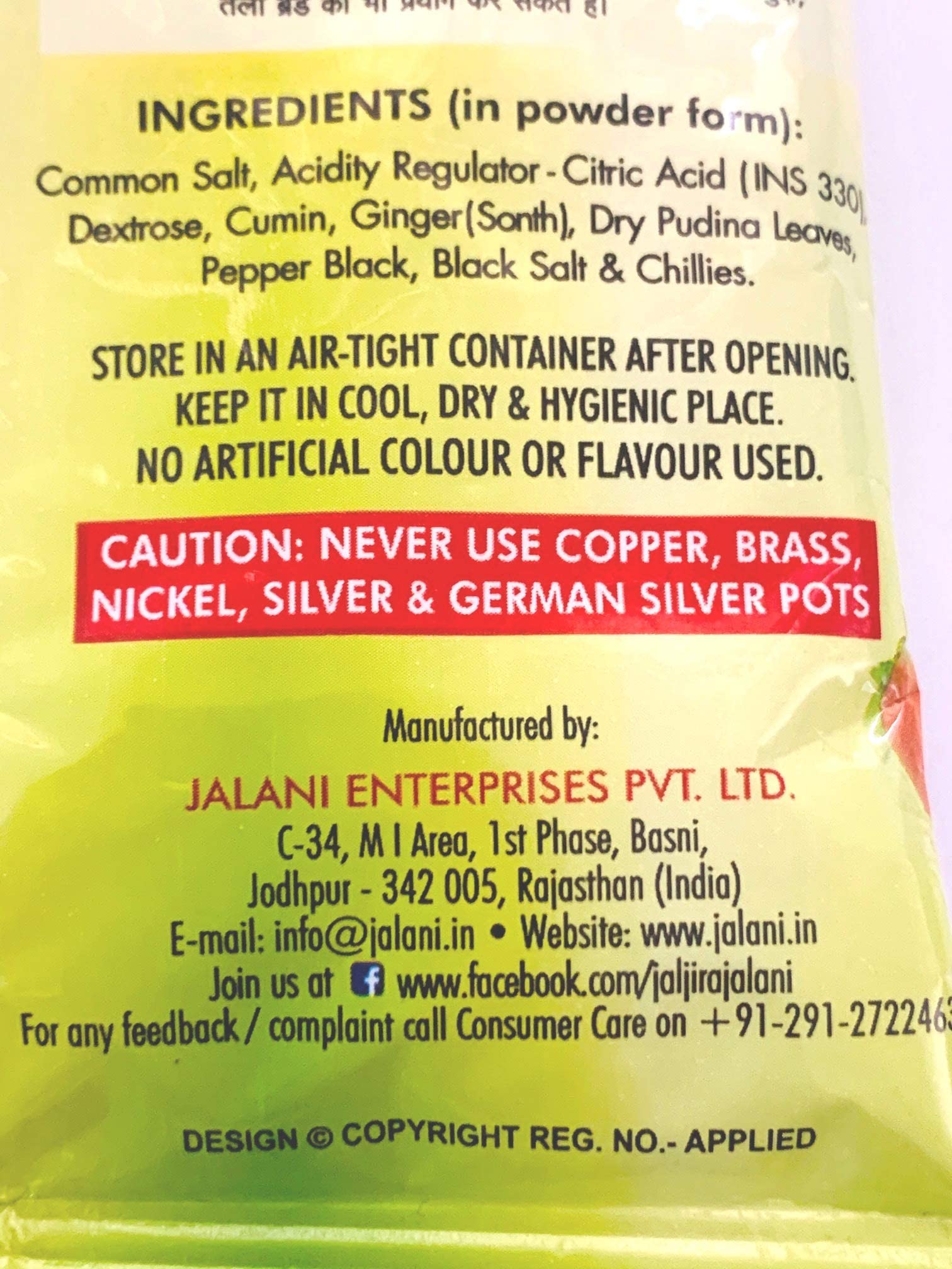Q: Can Jalani Jaljira be used in cooking?A: Absolutely! Jalani Jaljira can be used as a seasoning in cooking to enhance flavors. It can be added to various dishes or used as a garnish with ingredients like boondi or chopped mint leaves.