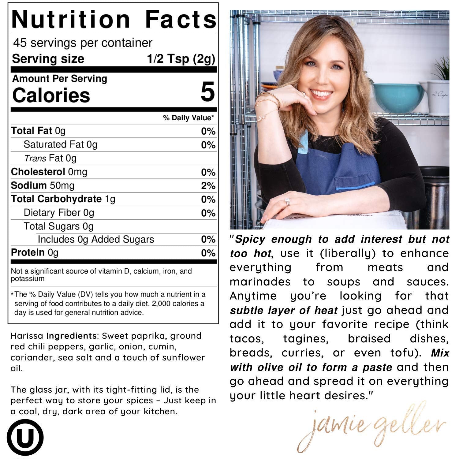 - Q: What types of cuisines can I use Harissa spice seasoning in? A: Jamie Geller Harissa spice seasoning is commonly used in North African and Moroccan cuisines but can also enhance a variety of dishes from tacos to tagines and curries.